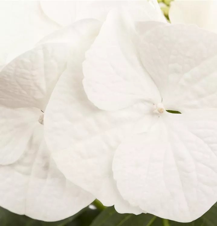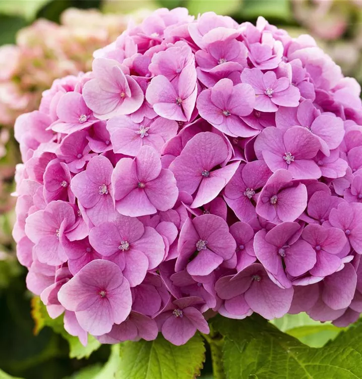Die sommergrünen Blätter der Bauernhortensie sind mittelgrün, eiförmig, gesägt.
