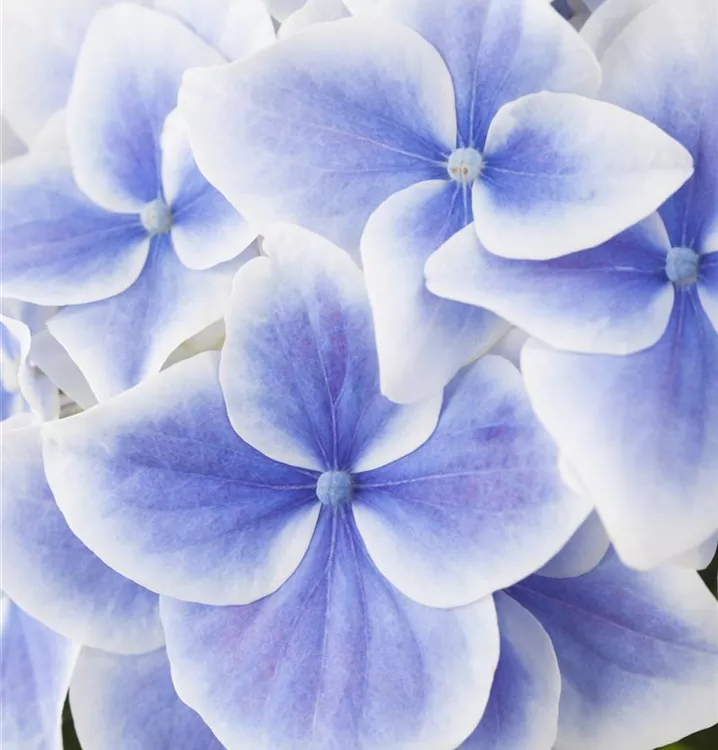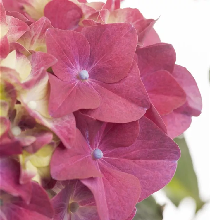 Die blauen, rosafarbenen, roten, weißen, schalenförmigen Blüten der Bauernhortensie erscheinen in Dolden von Juni bis September.