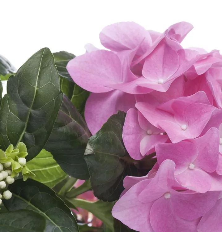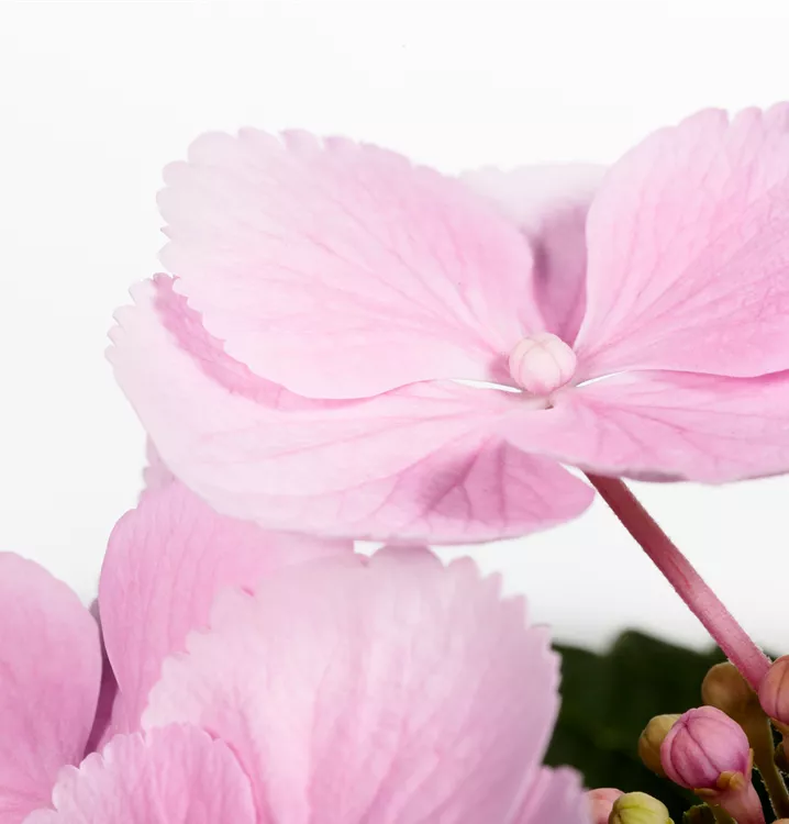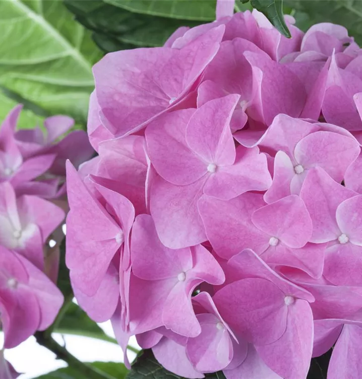 Die rosafarbenen, schalenförmigen Blüten der Bauernhortensie erscheinen in Dolden von Juni bis September.