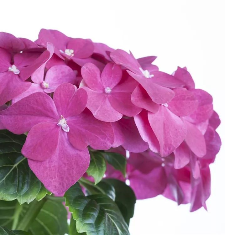 Die sommergrünen Blätter der Bauernhortensie sind mittelgrün, eiförmig, gesägt.