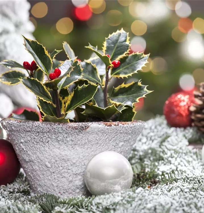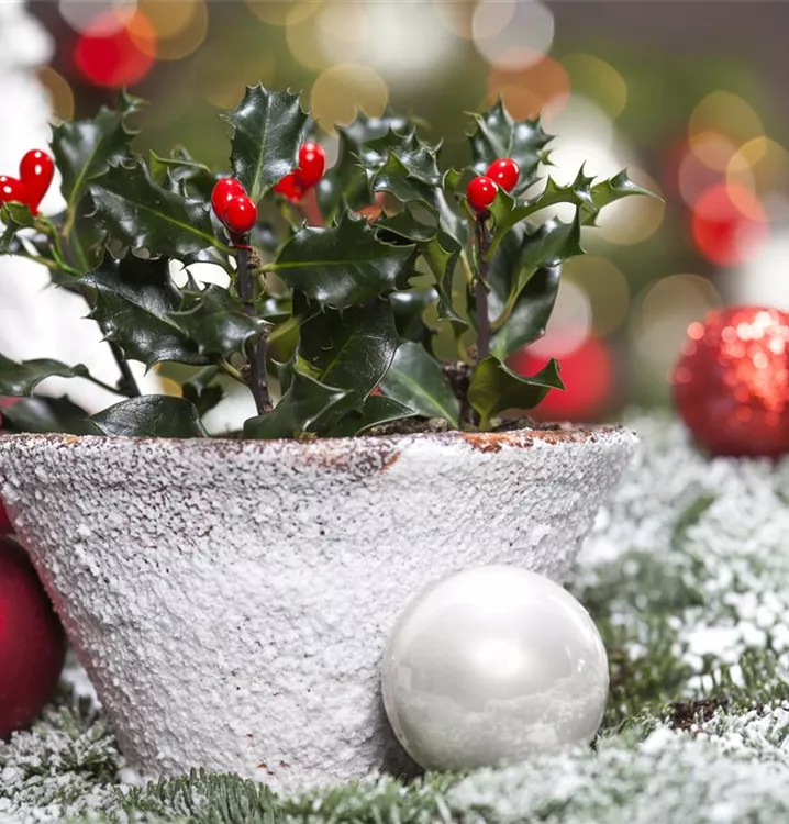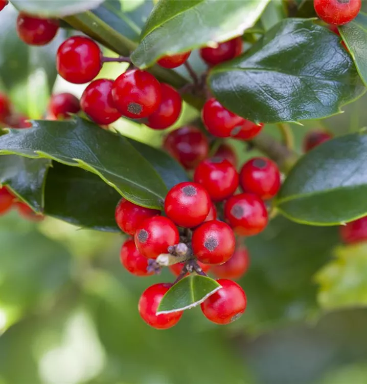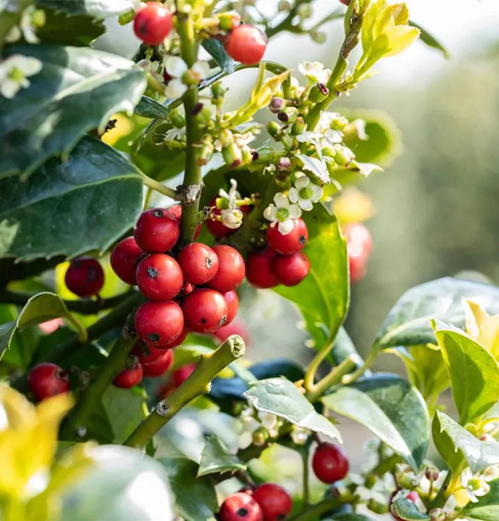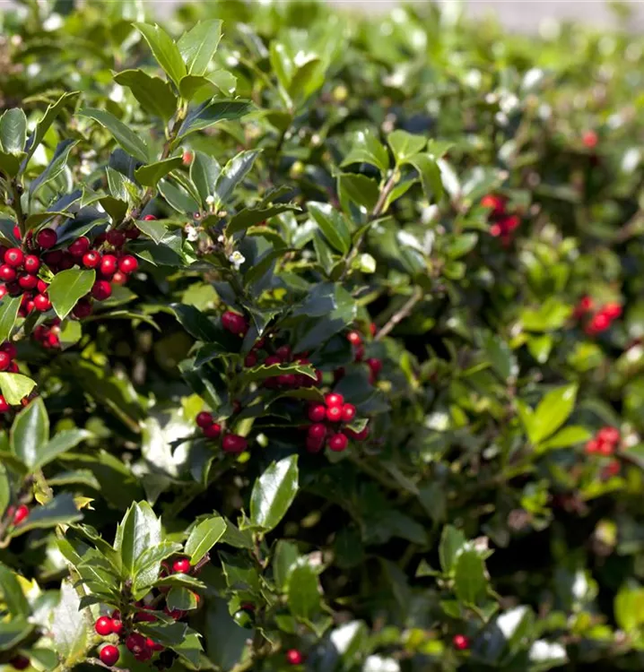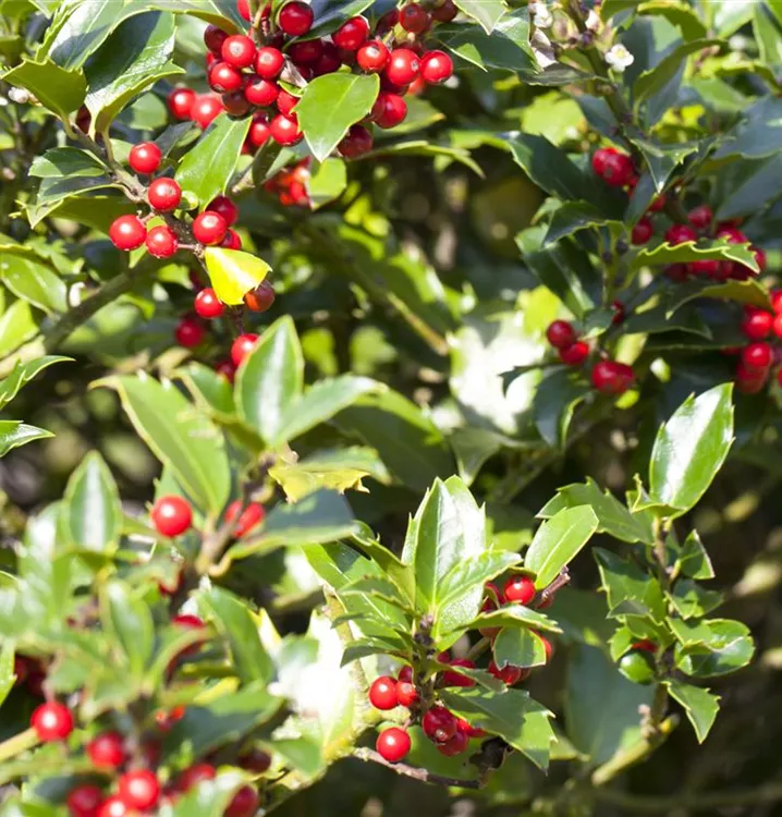Besonders dekorativ sind die roten Steinfrüchte von Ilex aquifolium. Diese erscheinen ab Oktober.Haften sehr lange.