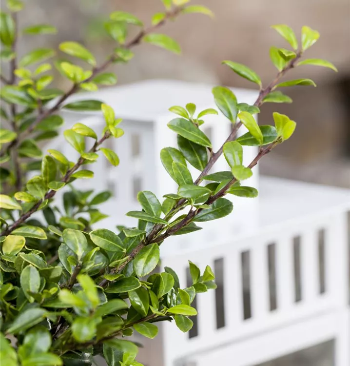 Besonders dekorativ sind die schwarzen Früchte von Ilex crenata. Haften sehr lange.