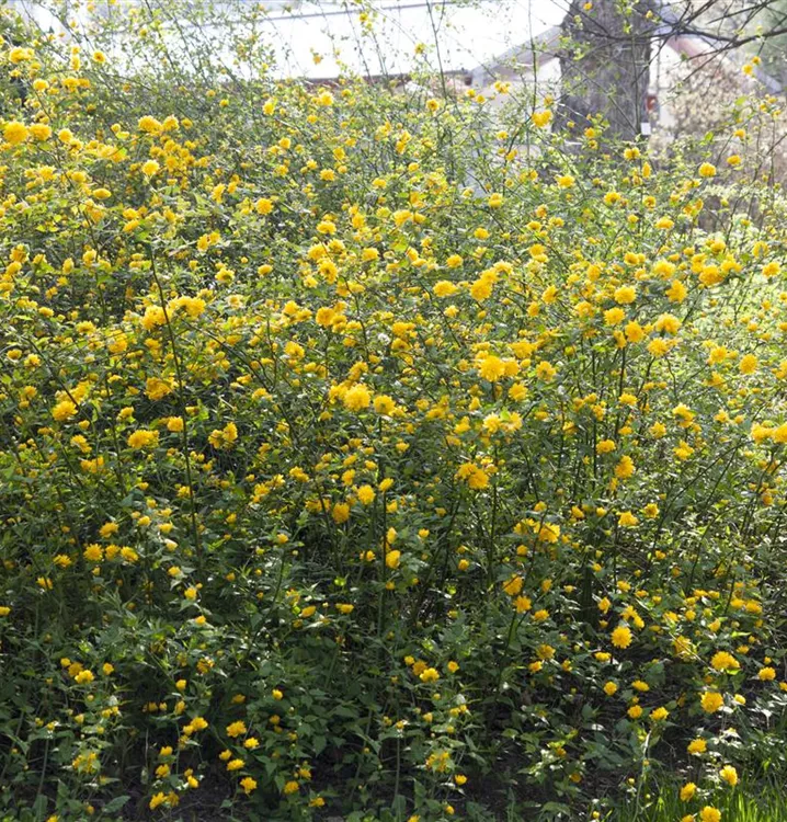 Der Gemeine Ranunkelstrauch (Kerria japonica) ein überhängender Strauch, der, je nach Sorte, schalenförmige Blüten in verschiedenen Farben hervorbringt. Seine Rinde ist grün. An einem sonnigen bis halbschattigen Standort mit durchlässigem, humosem Boden erreicht er gewöhnlich eine Höhe von ca. 2 m und wird ca. 2 m breit.