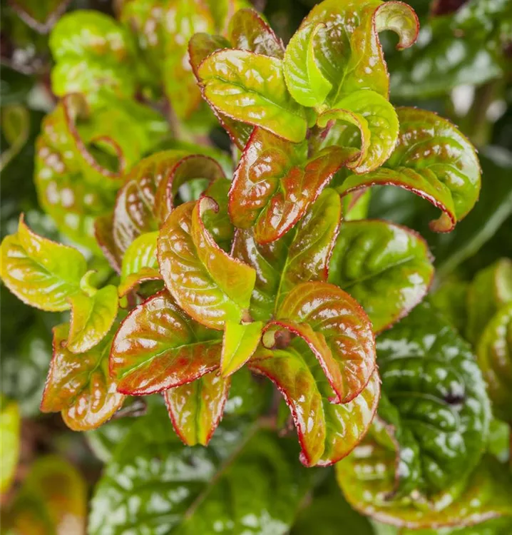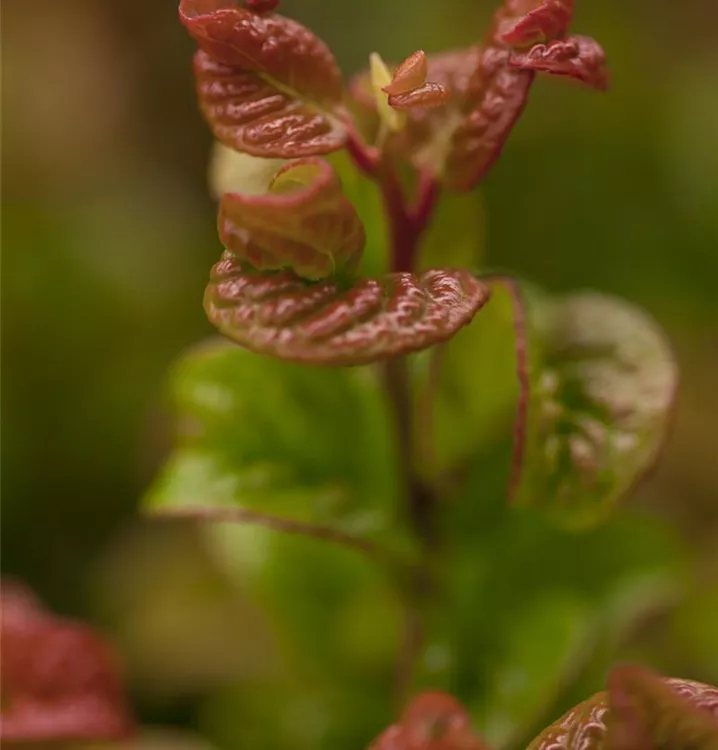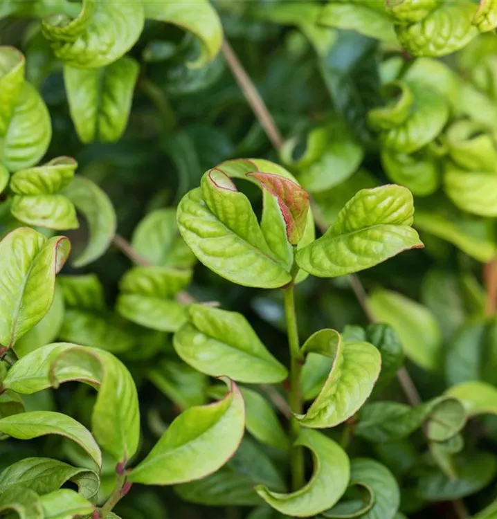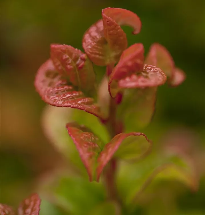 Die immergrünen Blätter der Traubenheide 'Curly Red'® sind dunkelgrün, lanzettlich, glänzend, wechselständig, gezähnt. Roter Austrieb. Mit seinem purpurroten Laub setzt sie schöne Akzente im Winter.