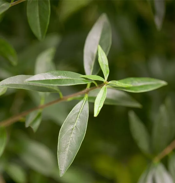 Die wintergrünen Blätter des Gemeinen Ligusters sind dunkelgrün, lanzettlich, ledrig, gegenständig.