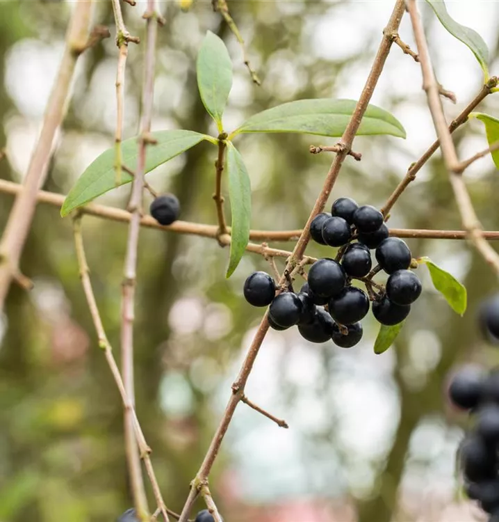 Besonders dekorativ sind die schwarzen, runden Früchte von Ligustrum vulgare. Diese erscheinen ab September.