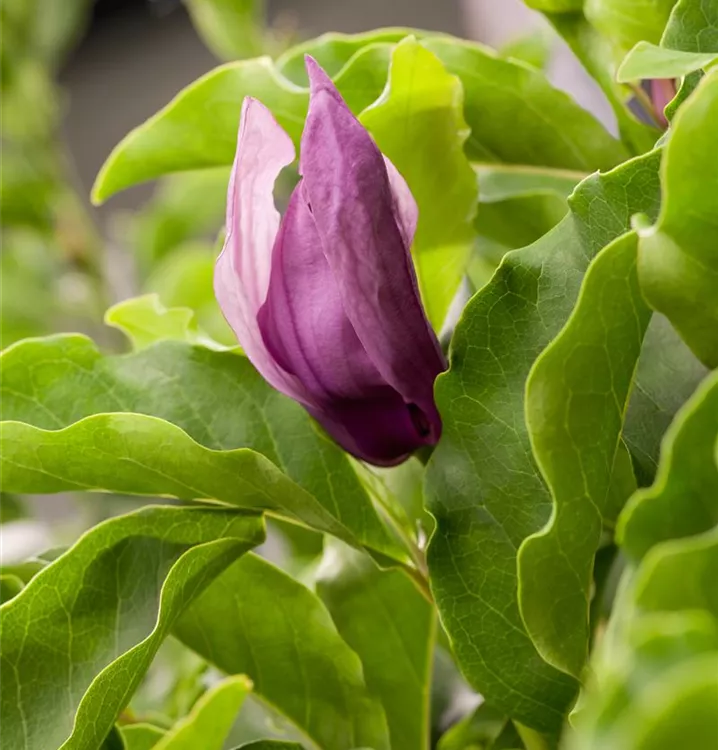 Die sommergrünen Blätter der Purpurmagnolie sind dunkelgrün, eiförmig, glänzend.