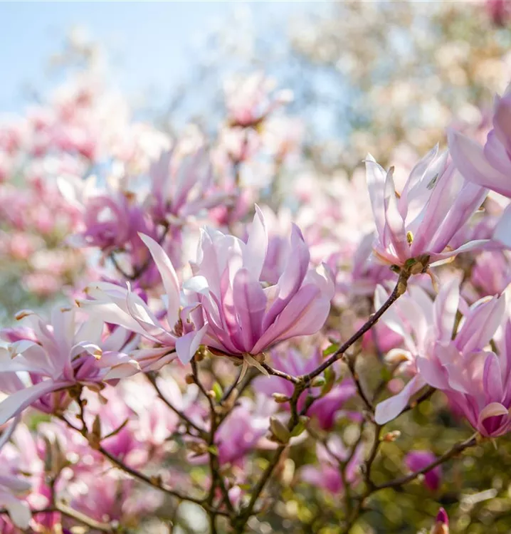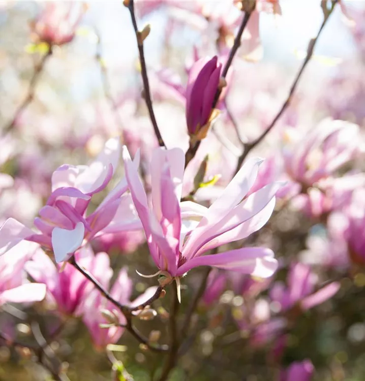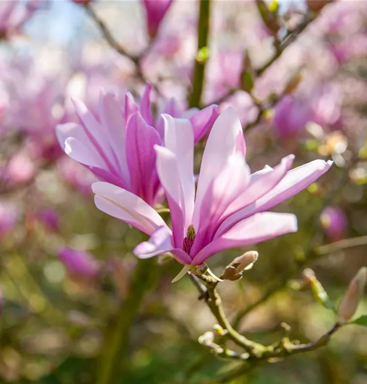 Die Purpurmagnolie (Magnolia liliiflora) ein strauchartiger Großstrauch, der, je nach Sorte, trichterförmige Blüten in verschiedenen Farben hervorbringt. An einem sonnigen bis halbschattigen Standort mit durchlässigem, humosem, nährstoffreichem Boden erreicht sie gewöhnlich eine Höhe von ca. 4 m und wird ca. 3 m breit.