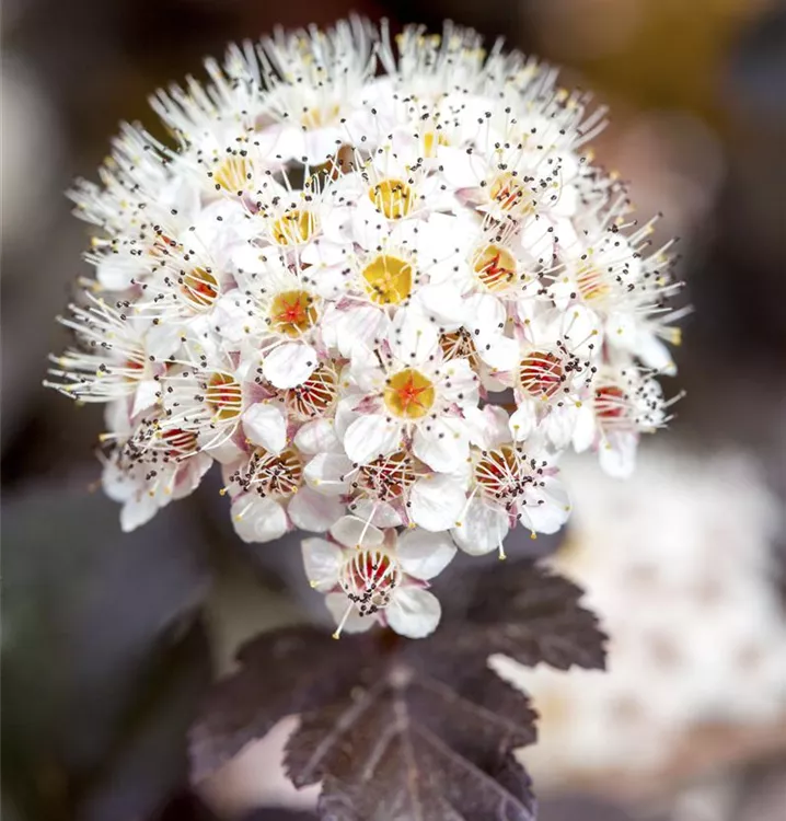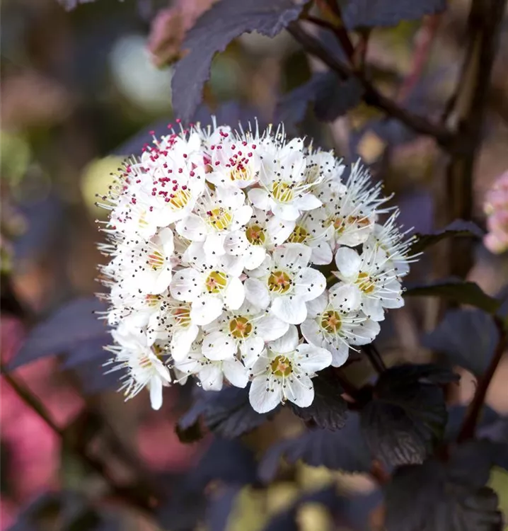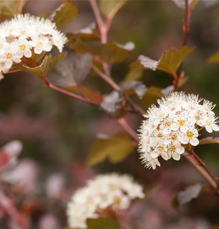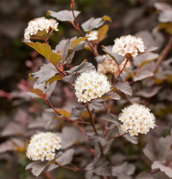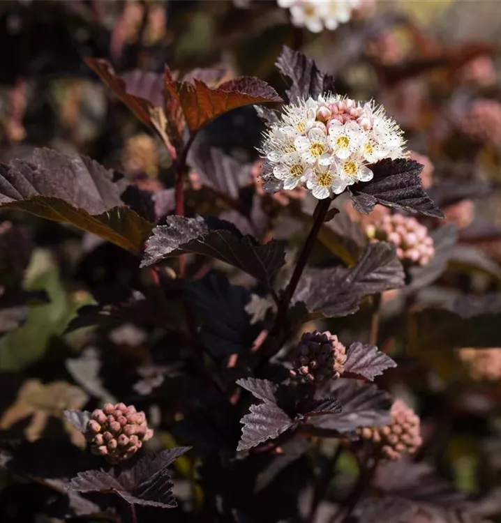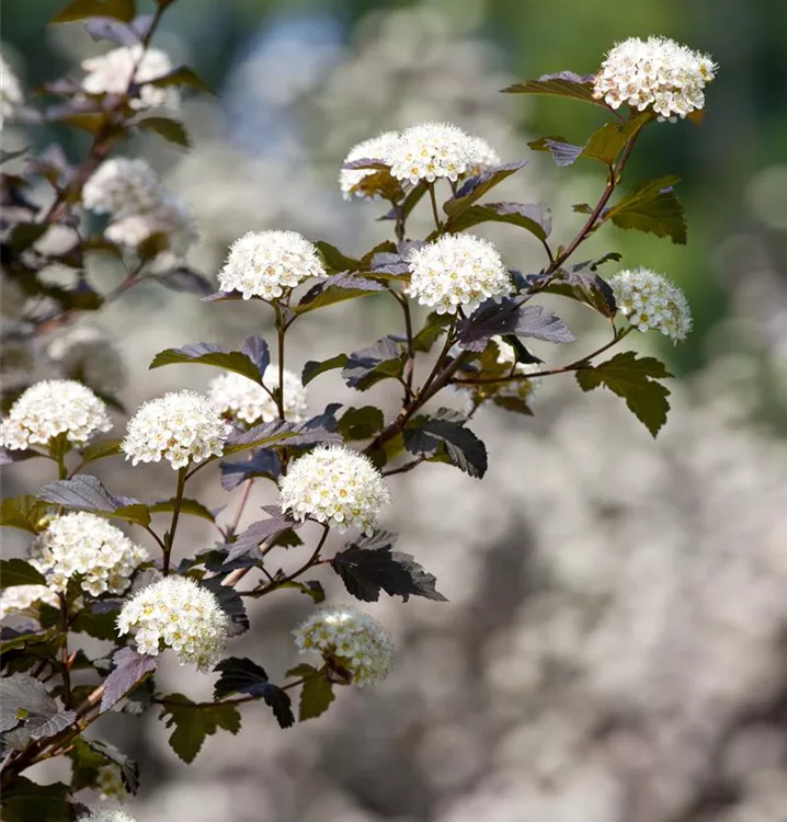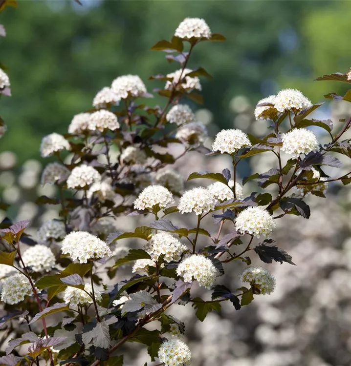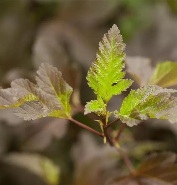 Die Fasanenspiere 'Diabolo'® (Physocarpus opulifolius) ist ein buschiger, aufrechter, Strauch mit dekorativen sommergrünen, eiförmigen, dunkelroten Blättern.