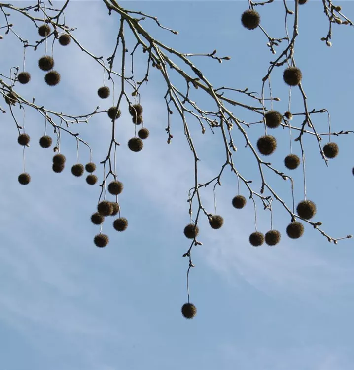 Besonders dekorativ sind die braun-gelben, runden Früchte von Platanus x hispanica. Diese erscheinen ab Oktober. Haften sehr lange.