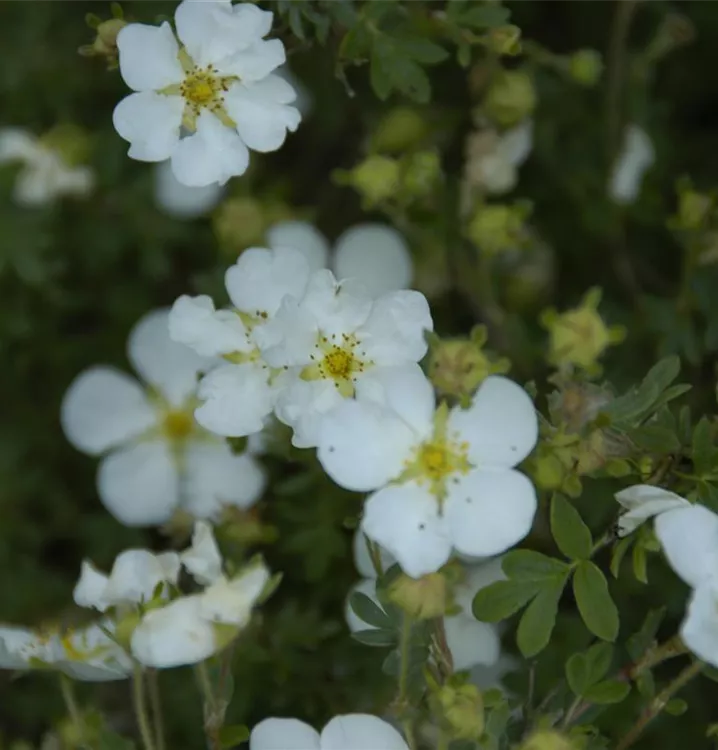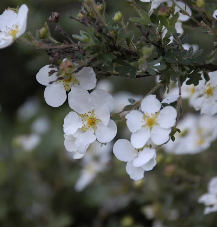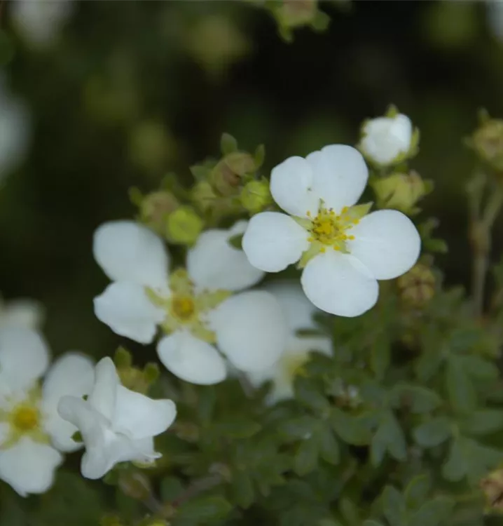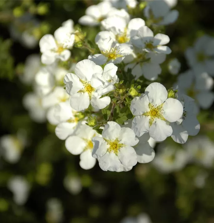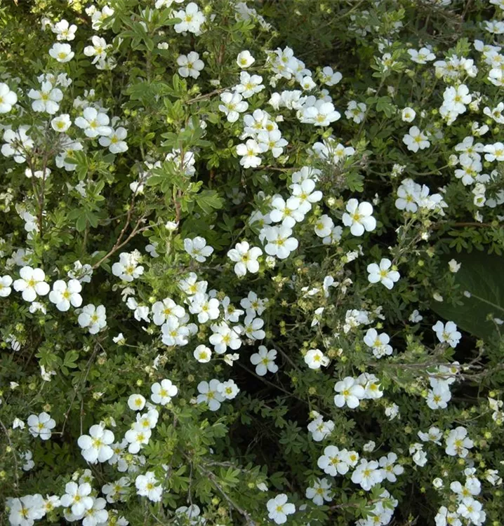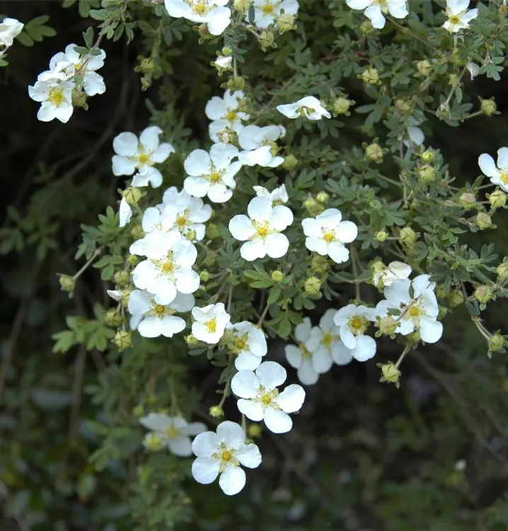 Der Fingerstrauch 'Abbotswood' (Potentilla fruticosa) ist ein buschiger, breiter Kleinstrauch, der weiße, schalenförmige Blüten hervorbringt. Sie erscheinen von Juni bis Oktober. Zudem trägt der Fingerstrauch 'Abbotswood', gefingerte, hellgrüne Blätter. An einem sonnigen bis halbschattigen Standort mit durchlässigem Boden erreicht er gewöhnlich eine Höhe von ca. 1 m und wird ca. 1,3 m breit.