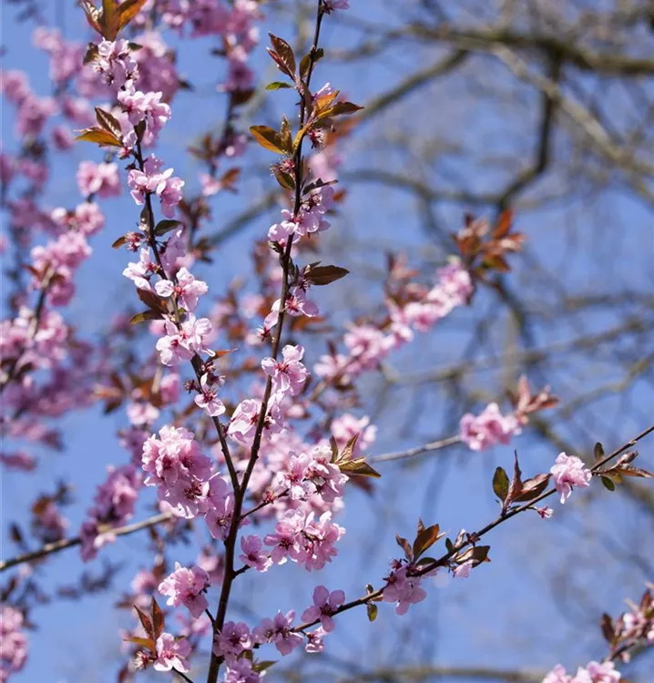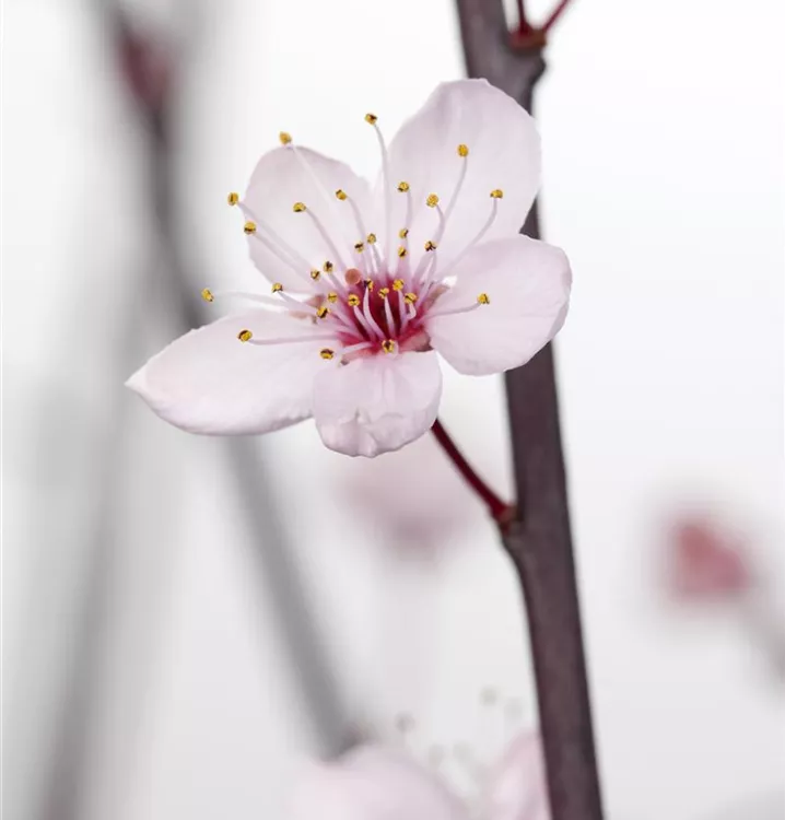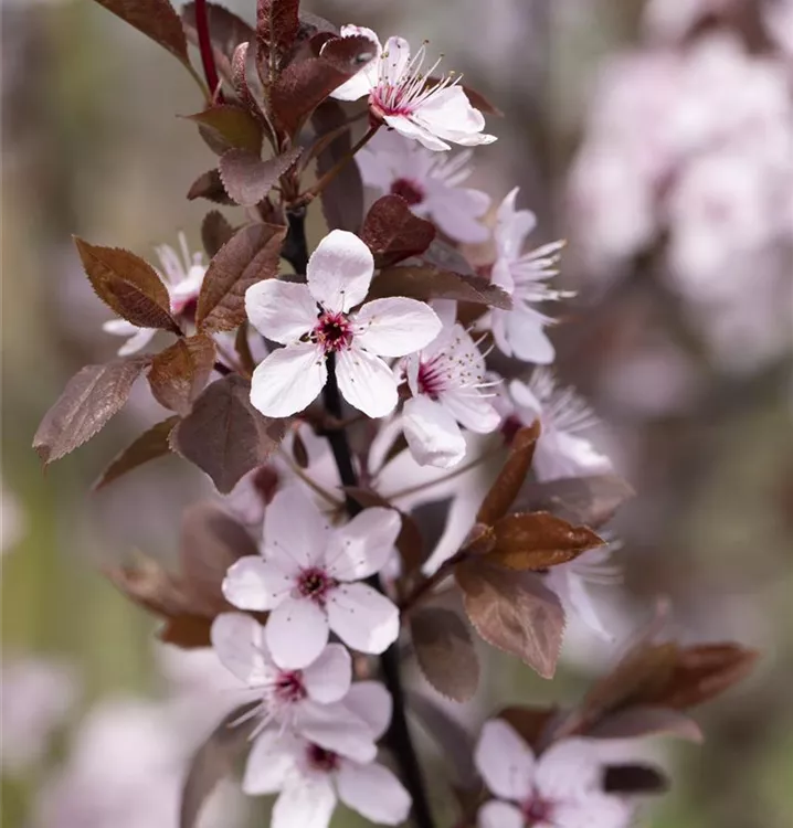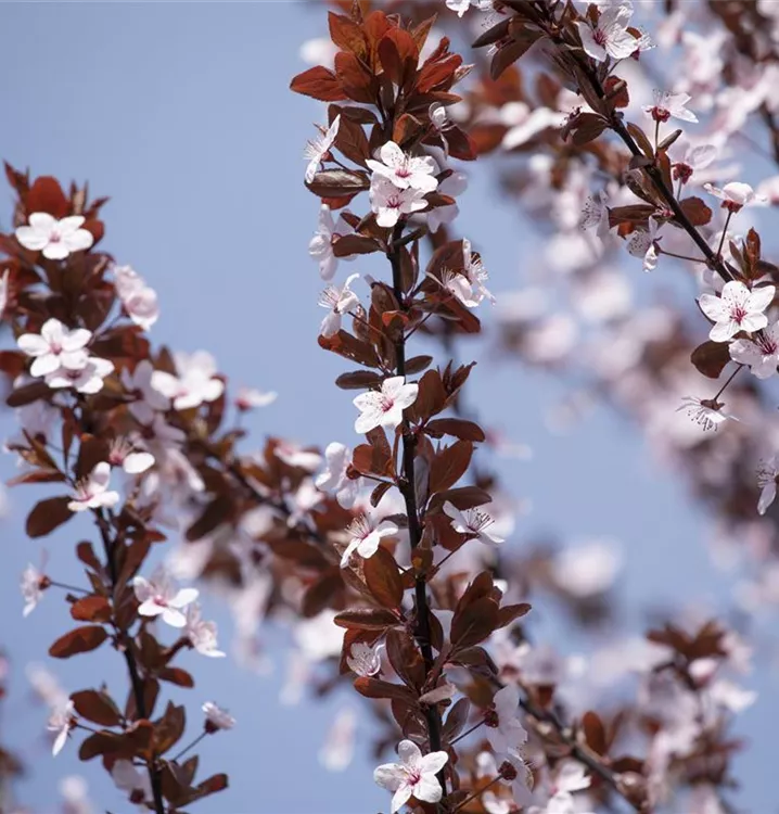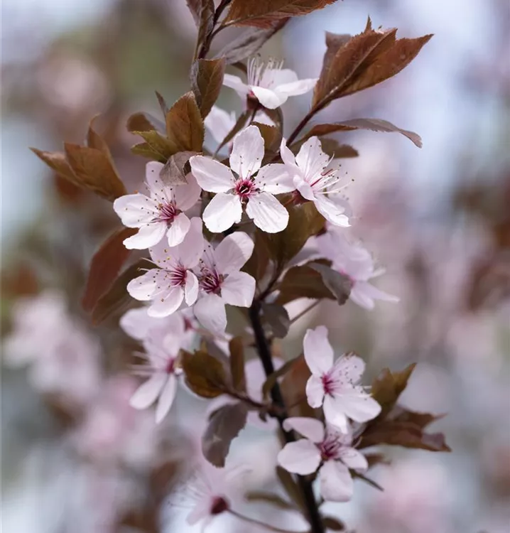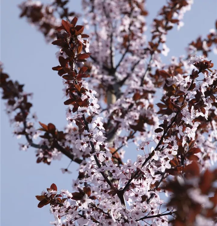 Die Blutpflaume 'Nigra' (Prunus cerasifera) ist ein rundlicher, malerischer Kleinbaum mit dekorativen, dunkelroten, runden Früchten. Die rosafarbenen, schalenförmigen Blüten erscheinen von März bis April.