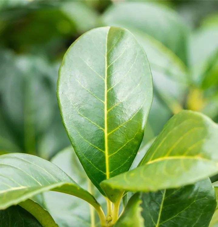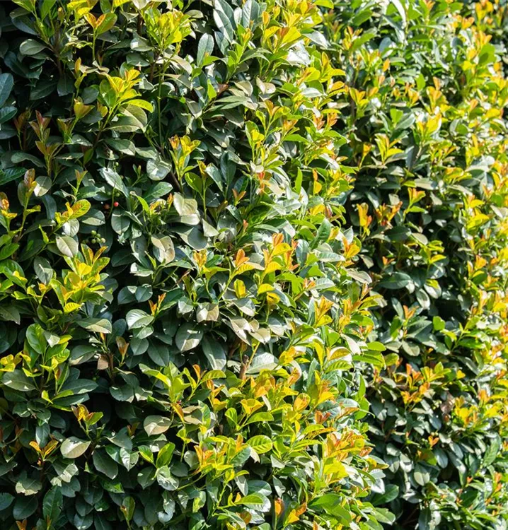 Die immergrünen Blätter der Lorbeerkirsche 'Etna'® sind dunkelgrün, eiförmig, glänzend, wechselständig. Kupferbrauner Austrieb.