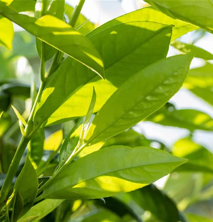 Die immergrünen Blätter der Lorbeerkirsche 'Novita' sind hellgrün, eiförmig, glänzend, wechselständig. Diese sind etwa 15 - 20 cm groß.