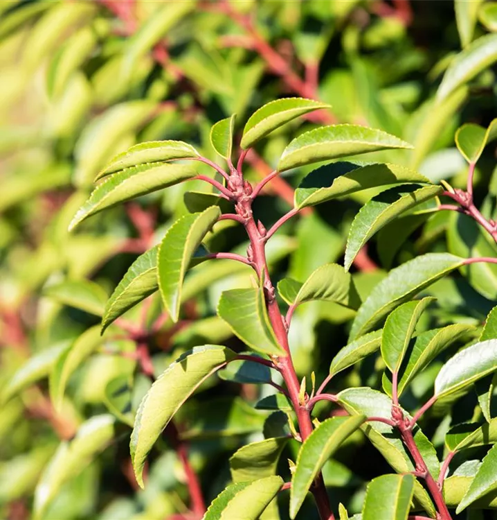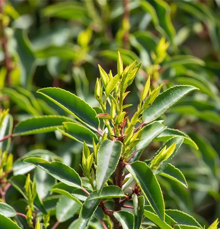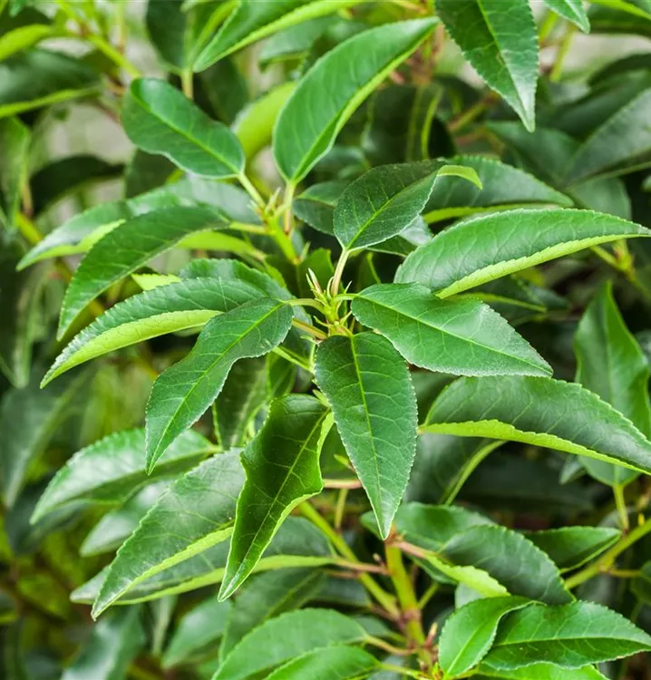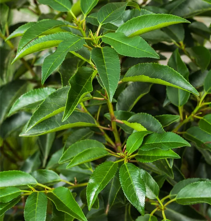 Die immergrünen Blätter der Portugiesische Lorbeerkirsche sind dunkelgrün, lanzettlich, glänzend, wechselständig. Diese sind etwa 6 - 12 cm groß.
