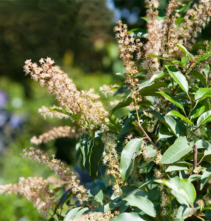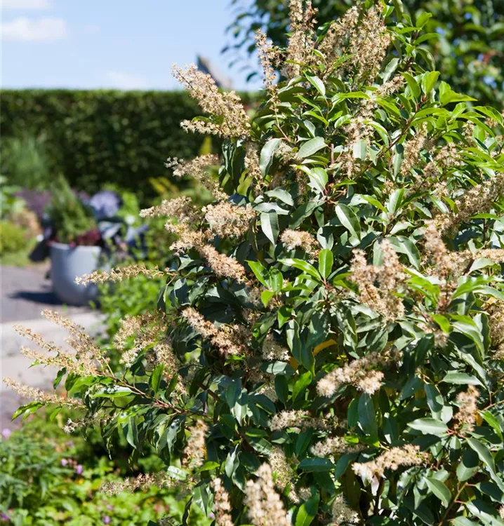 Die weißen Blüten der Portugiesischen Lorbeerkirsche erscheinen in Trauben von Juni bis Juli.