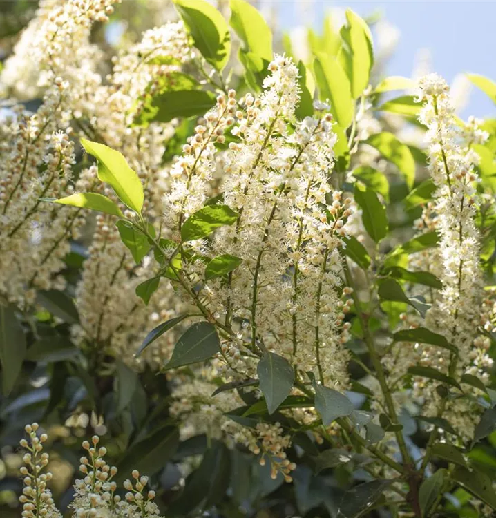 Die weißen Blüten der Portugiesischen Lorbeerkirsche 'Angustifolia' erscheinen in Trauben von Juni bis Juli.