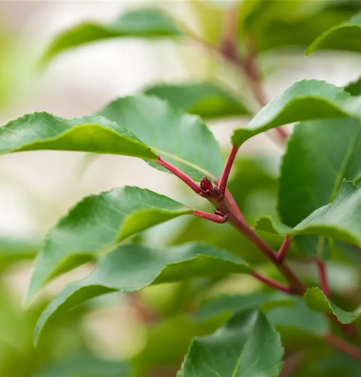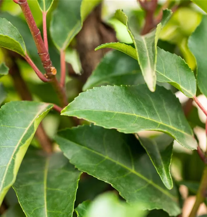 Die Triebe von Prunus lusitanica 'Angustifolia' sind rot.