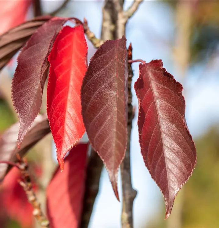 Hoher Blattschmuckwert. Die sommergrünen Blätter der Japanische Nelkenkirsche 'Royal Burgundy'® sind purpurrot, eiförmig, gesägt. Diese sind etwa 8 - 12 cm groß. Japanische Nelkenkirsche 'Royal Burgundy'® zeigt sich leuchtend kupferbraun im Herbst.