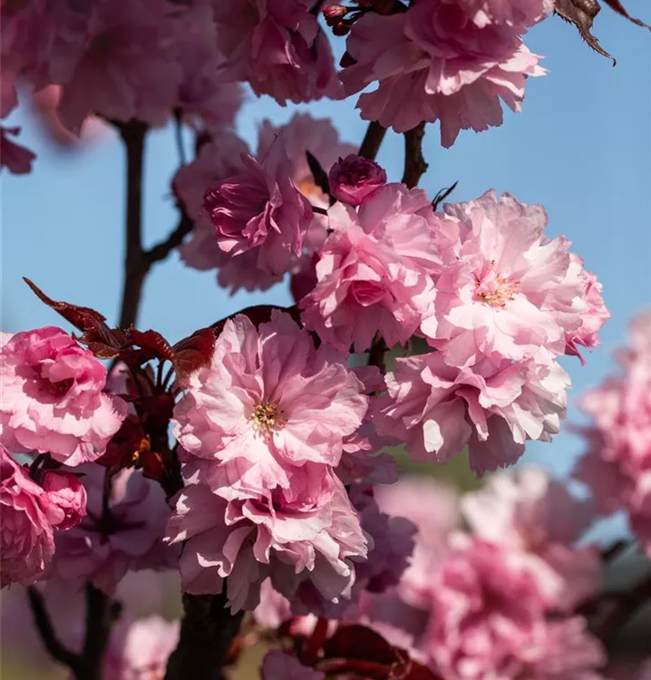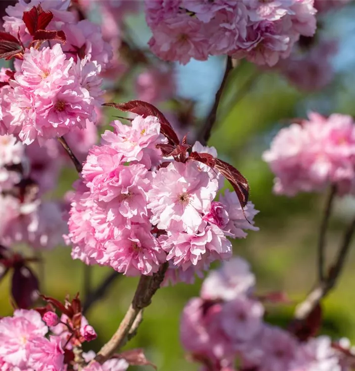 Die Japanische Nelkenkirsche 'Royal Burgundy'® (Prunus serrulata) ist ein ausladender, trichterförmiger Großstrauch mit dekorativen Früchten. Die rosafarbenen Blüten erscheinen von Ende April bis Anfang Mai. Zudem trägt die Japanische Nelkenkirsche 'Royal Burgundy'® dekorative, sommergrüne, eiförmige, purpurrote Blätter.