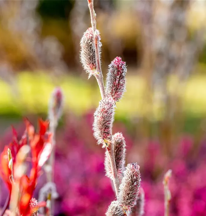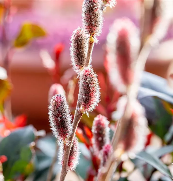 Die Weide 'Rotkätzchen'® (Salix) ein aufrechter Strauch, der, je nach Sorte, Blüten in verschiedenen Farben hervorbringt. An einem sonnigen bis halbschattigen Standort erreicht sie gewöhnlich eine Höhe von ca. 3 m und wird ca. 3 m breit. An den Boden stellt die Weide 'Rotkätzchen'® keine besonderen Ansprüche.