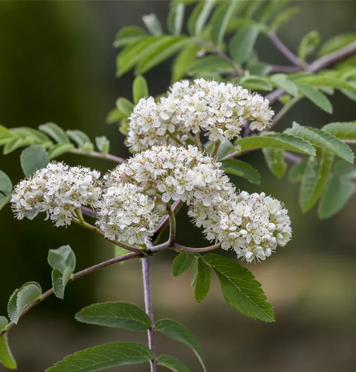 Die weißen Blüten der Eberesche 'Edulis' erscheinen in Dolden von Mai bis Juni.