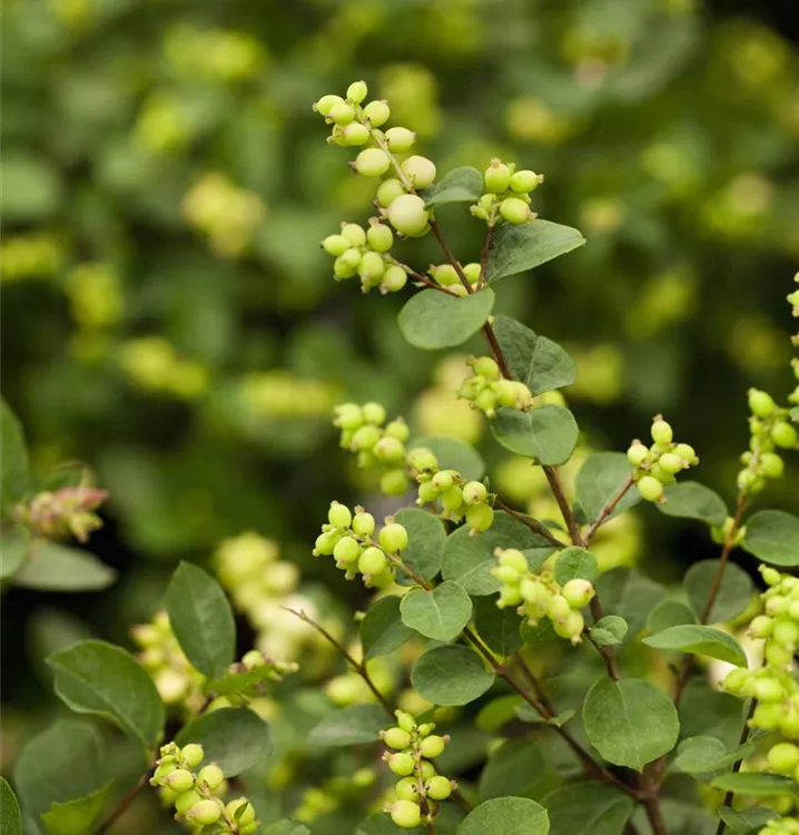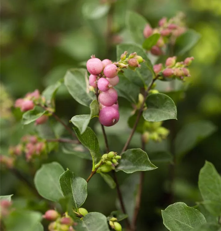 Besonders dekorativ sind die purpurroten, ovalen Beeren von Symphoricarpos x doorenbosii. Diese erscheinen ab Juli. Haften sehr lange.