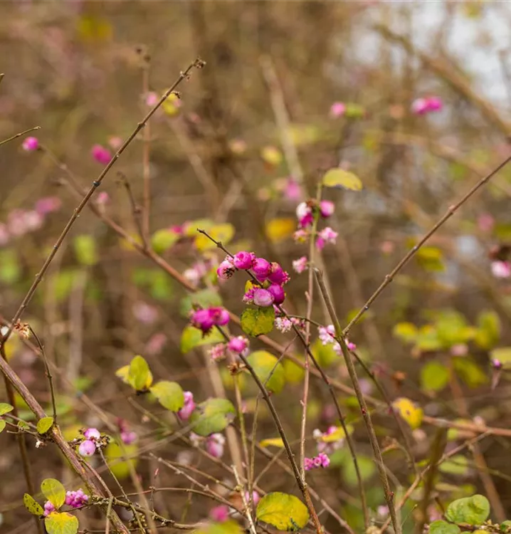 Die Purpurbeere (Symphoricarpos x doorenbosii) ist ein buschiger, dichter Kleinstrauch mit dekorativen, purpurroten, ovalen Früchten, die sehr lange haften. Die glockenförmigen Blüten erscheinen je nach Sorte in verschiedenen Farben.