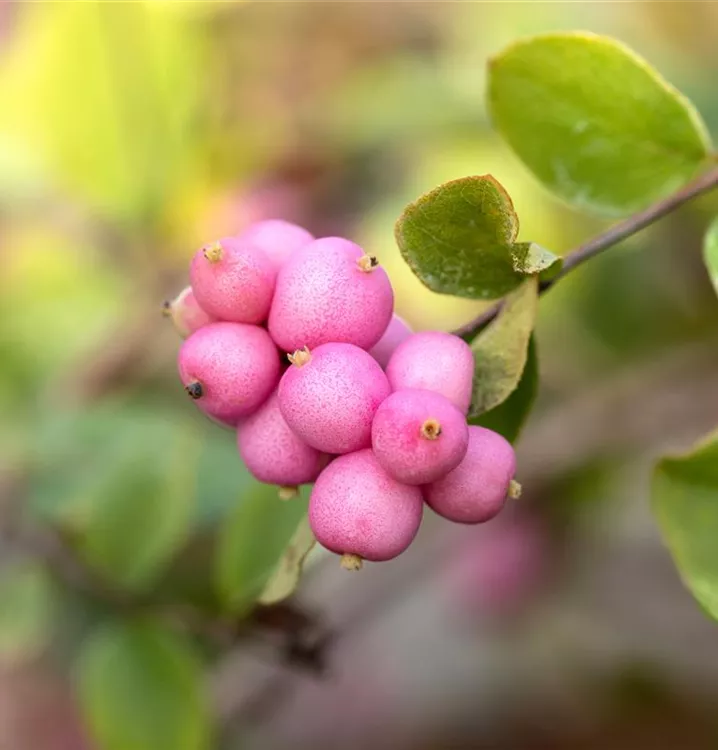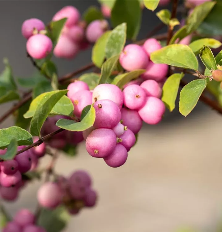 Besonders dekorativ sind die rosafarbenen, ovalen Beeren von Symphoricarpos x doorenbosii 'Mother of Pearl'. Diese erscheinen ab Juli. Haften sehr lange.