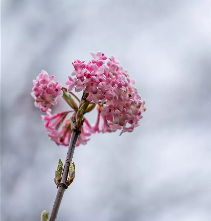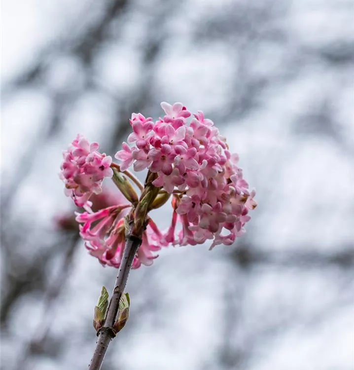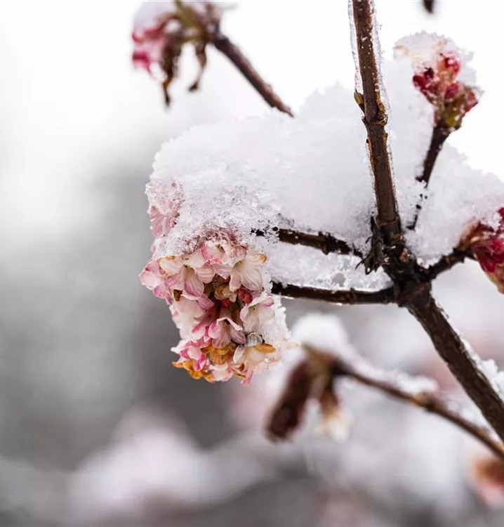 Der Winterschneeball (Viburnum x bodnantense) ist ein lockerer Strauch, der hellrosafarbene Blüten mit einem starken Duft hervorbringt. Sie erscheinen von Februar bis April. Zudem trägt der Winterschneeball, mittelgrüne Blätter. An einem sonnigen bis halbschattigen Standort mit durchlässigem, lockerem Boden erreicht er gewöhnlich eine Höhe von ca. 3 m und wird ca. 3 m breit.