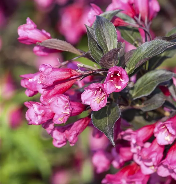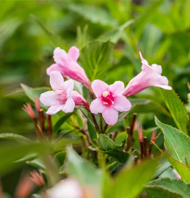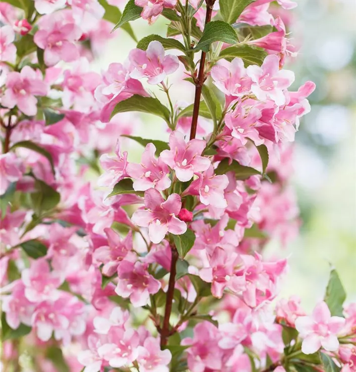 Die Rosa Weigelie (Weigela florida) ein buschiger, aufrechter Großstrauch, der, je nach Sorte, trichterförmige Blüten in verschiedenen Farben hervorbringt. An einem sonnigen bis halbschattigen Standort mit durchlässigem, nährstoffreichem Boden erreicht sie gewöhnlich eine Höhe von ca. 3,5 m und wird ca. 4 m breit.