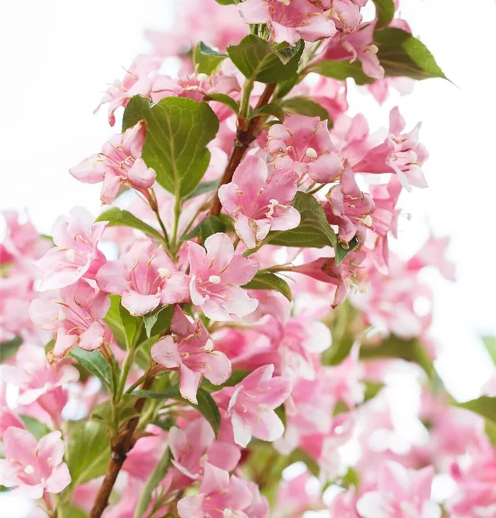 Rosa Weigelie ist ein buschig und aufrecht wachsender Großstrauch. Sie erreicht gewöhnlich eine Höhe von 3 - 3,5 m und wird ca. 3 - 4 m breit.