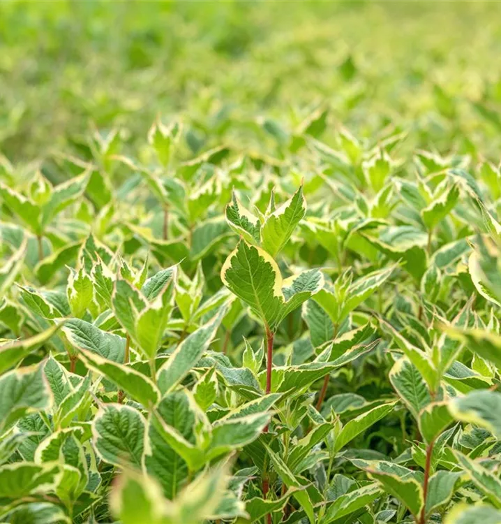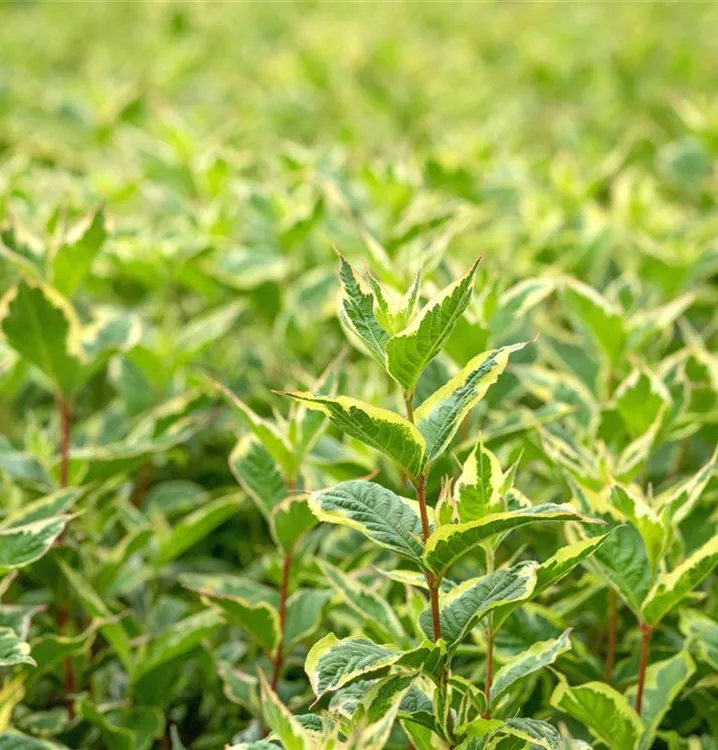 Buntblättrige Weigelie 'Nana Variegata' ist ein buschig, breit und kompakt wachsender Kleinstrauch. Sie erreicht gewöhnlich eine Höhe von 1,5 - 2 m und wird ca. 1 - 2,5 m breit.