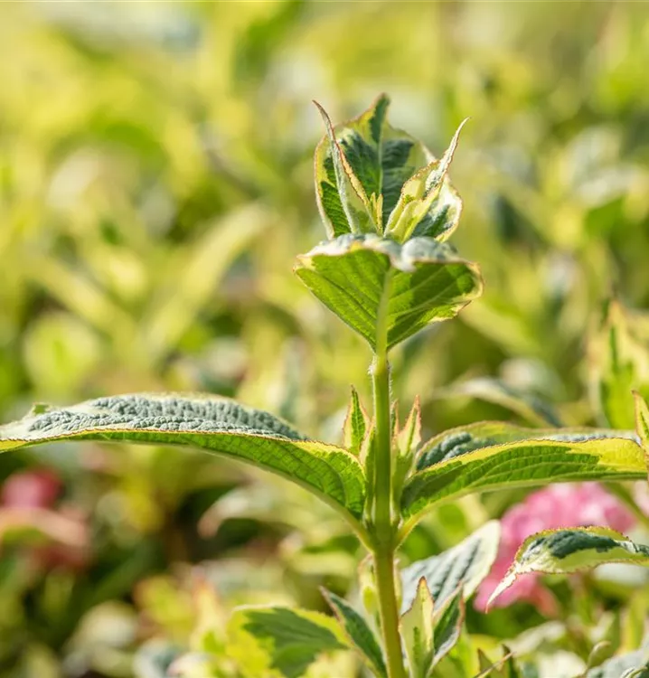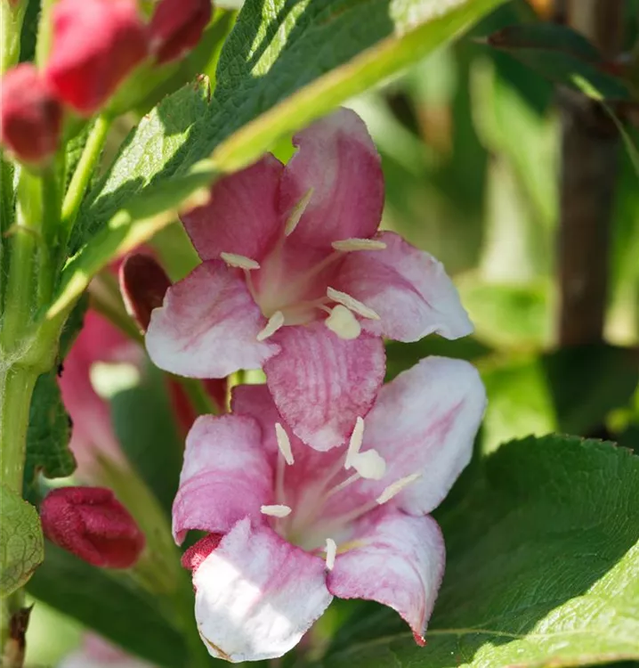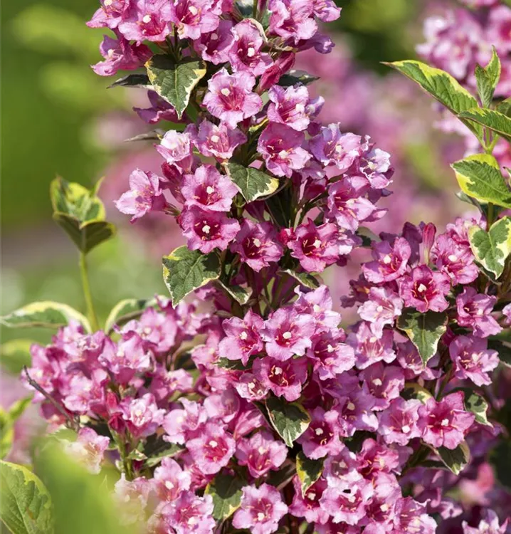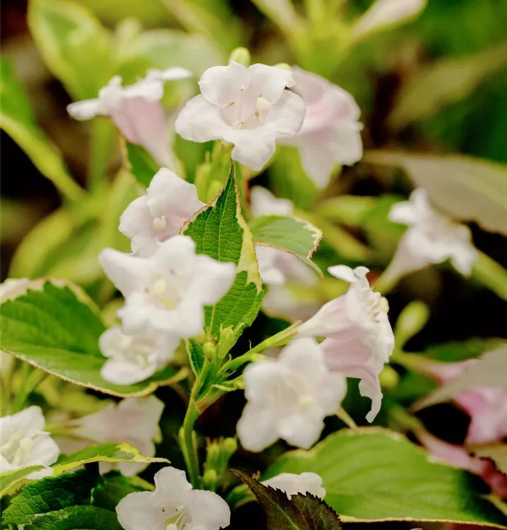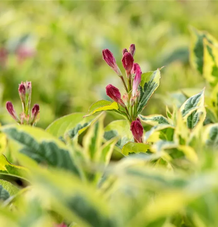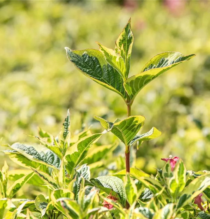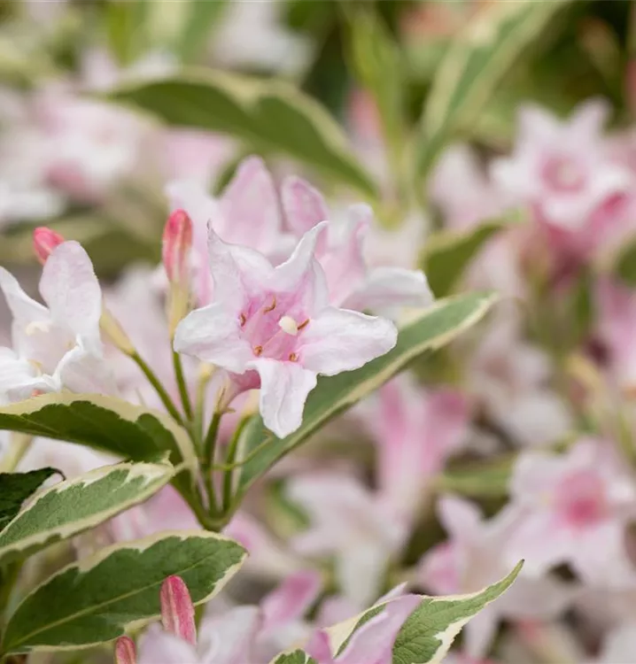 Die Buntblättrige Weigelie 'Nana Variegata' (Weigela florida) ist ein buschiger, breiter, kompakter, sommergrüner Kleinstrauch mit dekorativen, eiförmigen, grünen Blättern mit einem weißen Rand. Zudem trägt sie von Mai bis Juni rosafarbene, trichterförmige Blüten. An einem sonnigen bis halbschattigen Standort mit durchlässigem, nährstoffreichem Boden erreicht sie gewöhnlich eine Höhe von ca. 2 m und wird ca. 2,5 m breit.