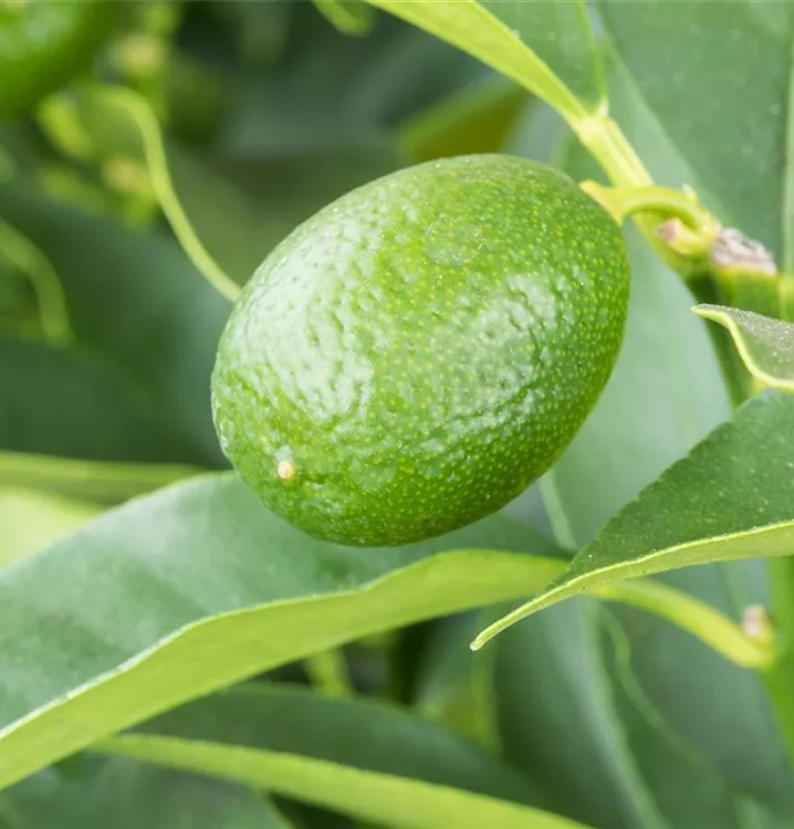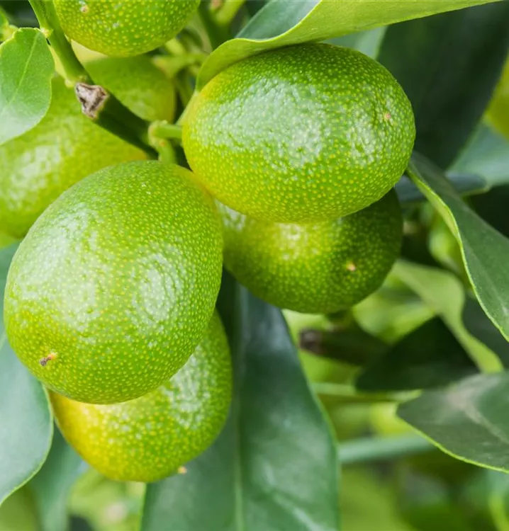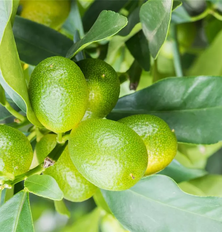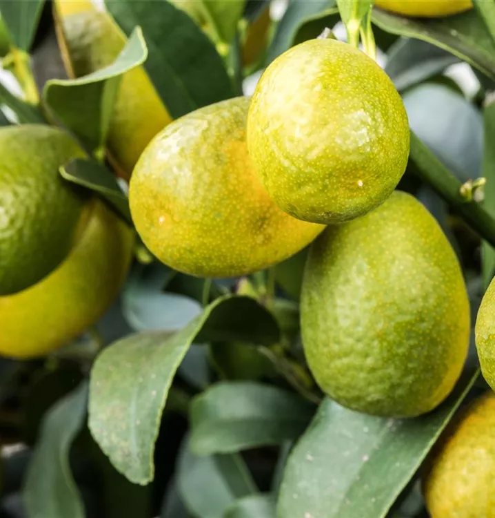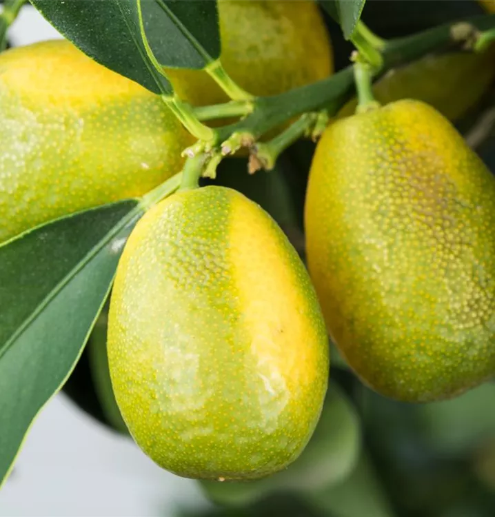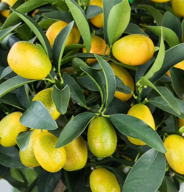 Die Ovale Kumquat (Citrus margarita) ist eine sehr beliebte, immergrüne Kübelpflanze, deren goldgelben, ovalen Früchte einen süßen, aromatischen Geschmack haben. Ihre dekorativen Blüten sind radförmig und erscheinen von Mai bis Juni. Sie verströmen einen angenehmen Duft. Die dunkelgrünen Blätter sind eiförmig und glänzend. Der Standort sollte möglichst sonnig sein. Eine durchlässige und kalkfreie Erde ist dabei ideal. Bei günstigen Bedingungen erreicht die Ovale Kumquat eine Höhe von ca. 3 m und wird bis zu 2 m breit.