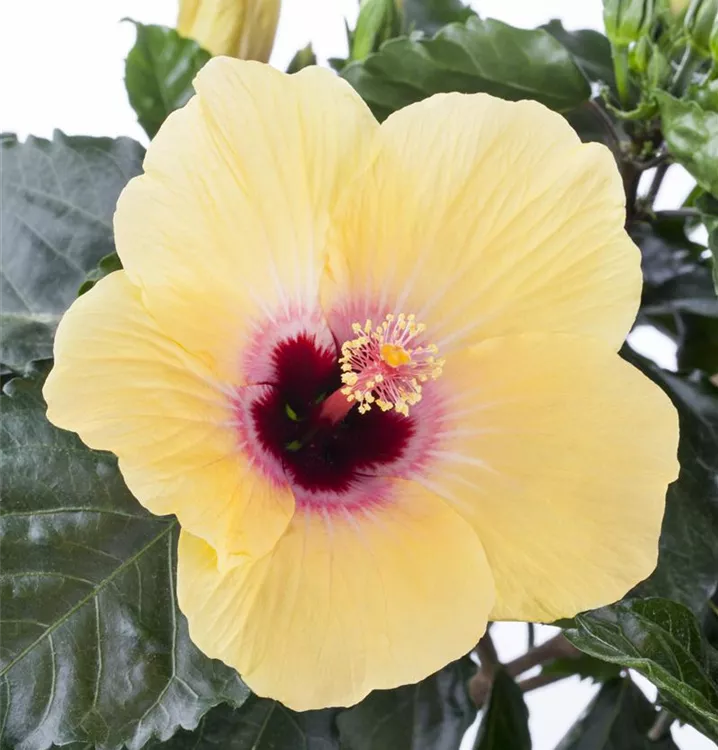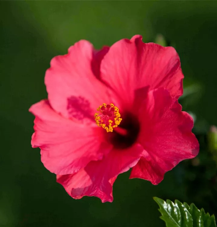 Der Chinesische Roseneibisch (Hibiscus rosa-sinensis) ist eine sehr beliebte, immergrüne Kübelpflanze. Seine dekorativen Blüten sind schalenförmig und erscheinen von Juni bis Oktober. Die dunkelgrünen Blätter sind eiförmig. Der Standort sollte möglichst sonnig bis halbschattig und geschützt sein. Eine durchlässige und nährstoffreiche Erde ist dabei ideal. Bei günstigen Bedingungen erreicht der Chinesische Roseneibisch eine Höhe von ca. 50 cm und wird bis zu 50 cm breit.