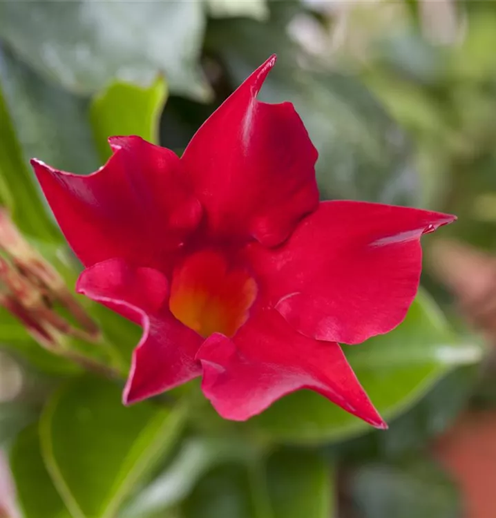 Die immergrünen Blätter der Dipladenia 'Sundaville'® sind dunkelgrün, eiförmig, glänzend.