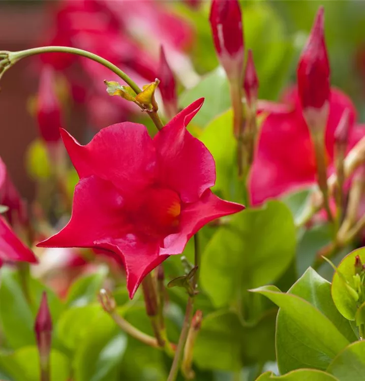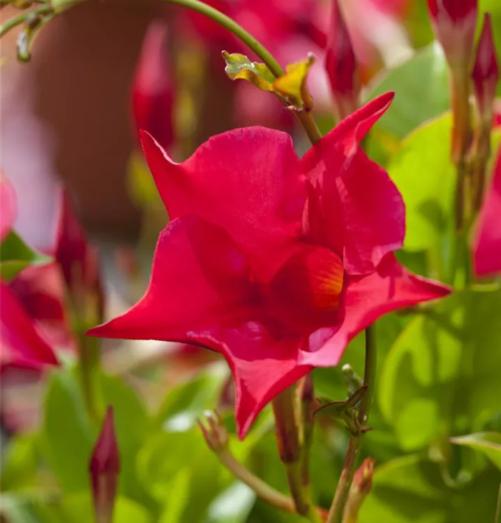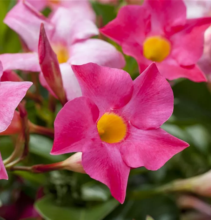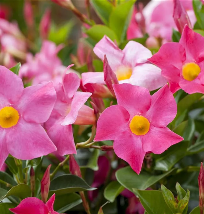 Im Sommer versinkt Ihr Garten in einem Blütenmeer, wenn Sie Dipladenia genug Raum im Beet geben. Die beliebte Sommerpflanze stammt aus Südamerika. Die Hundsgiftgewächse werden seit mehr als 100 Jahren kultiviert und wurden anfänglich auch als Zimmerpflanze gehalten. Dipladenia liebt einen sonnigen Standort. Für rankende Sorten empfiehlt sich eine Kletterhilfe. Die Pflanzen können in ihren Wurzeln viel Wasser speichern und benötigen entsprechend wenig Bewässerung. Gießen Sie mindestens alle zehn Tage, bei Hitze deutlich häufiger.