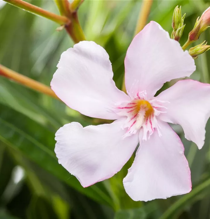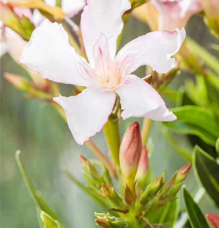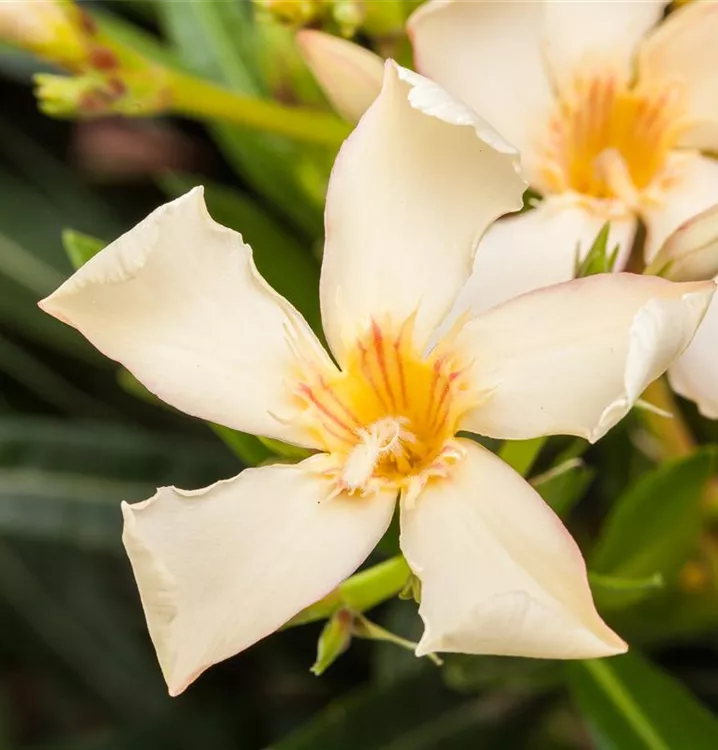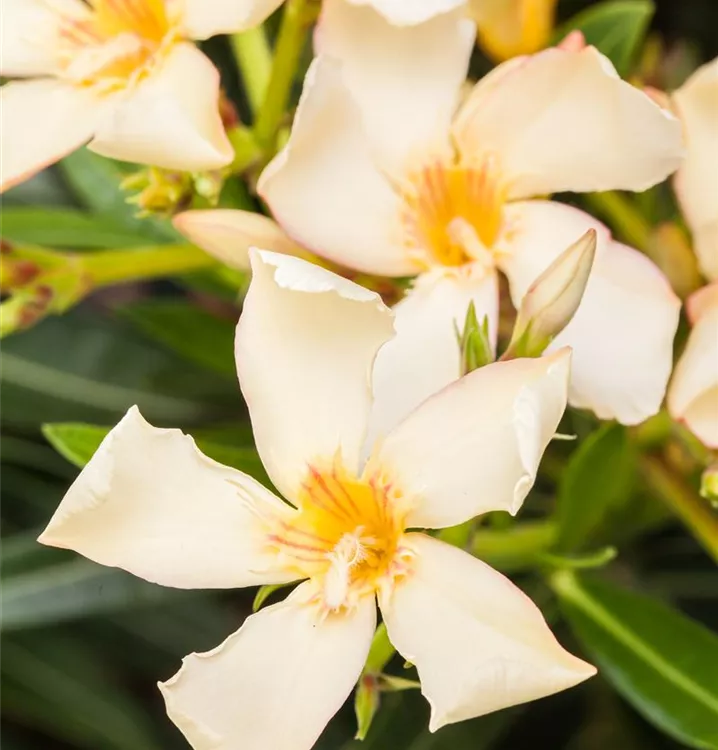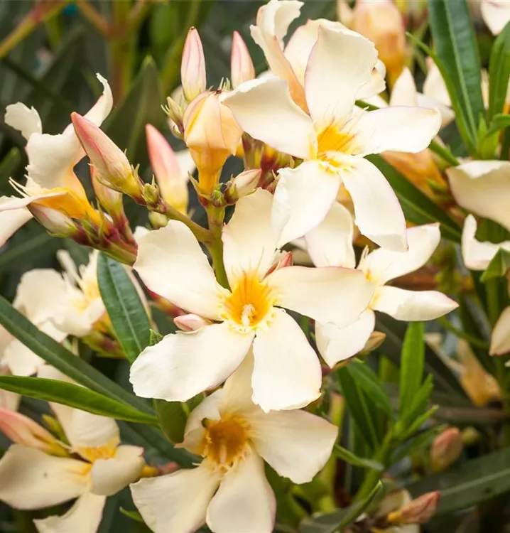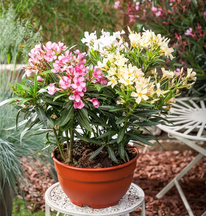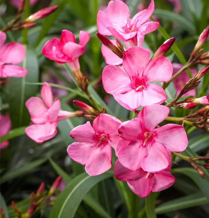 Nerium oleander bildet rosafarbene, weiße, gelbe Blüten ab Juni.