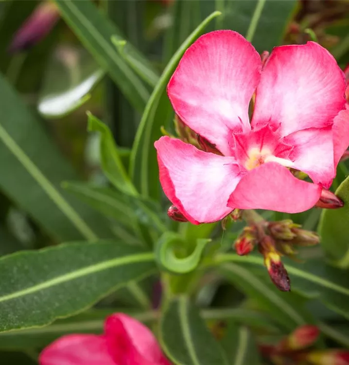 Der Oleander (Nerium oleander) ist eine sehr beliebte, immergrüne Kübelpflanze. Seine dekorativen Blüten erscheinen von Juni bis September. Die dunkelgrünen Blätter sind lanzettlich. Der Standort sollte möglichst sonnig und geschützt sein. Eine durchlässige und nährstoffreiche Erde ist dabei ideal. Bei günstigen Bedingungen erreicht der Oleander eine Höhe von ca. 2 m und wird bis zu 1,8 m breit.