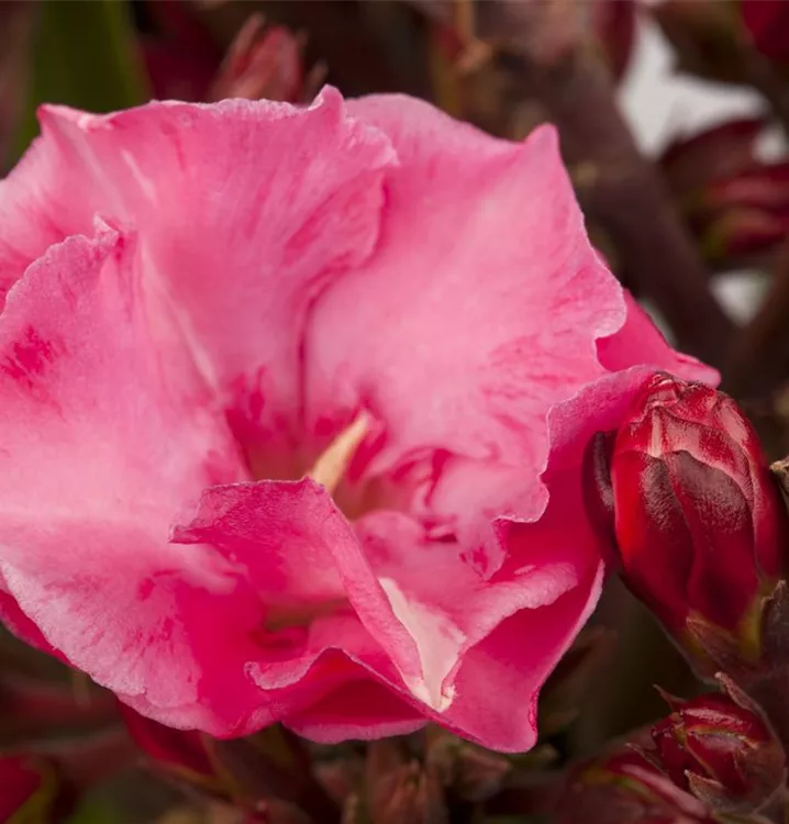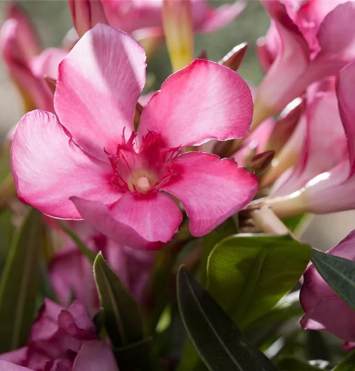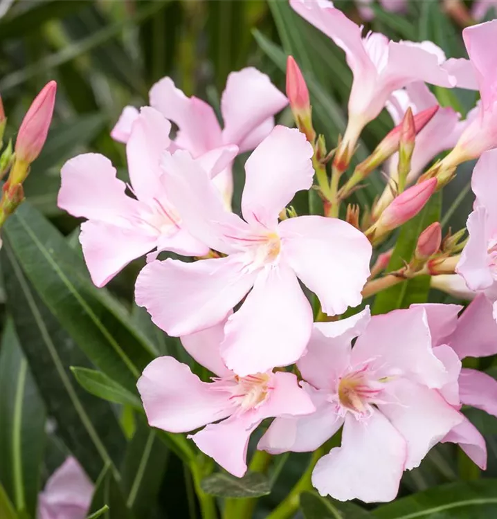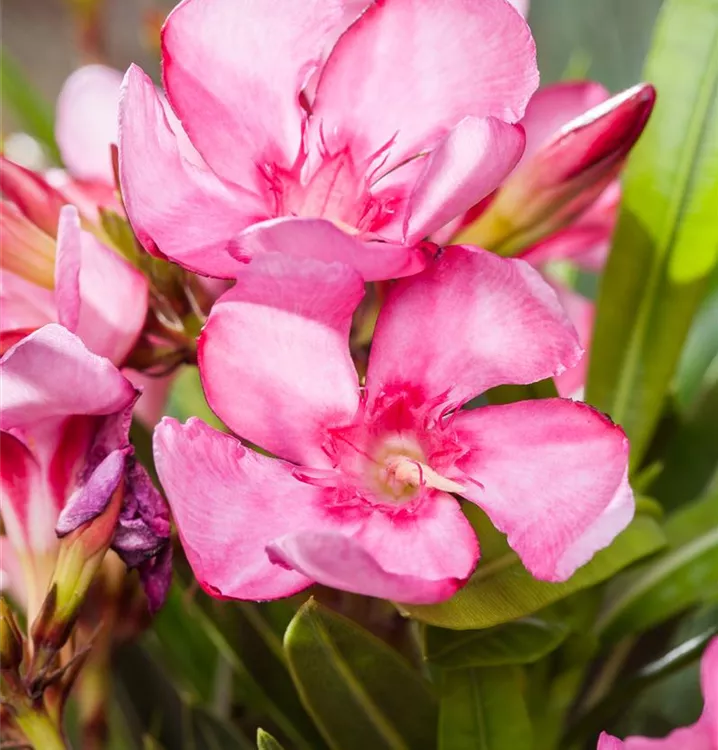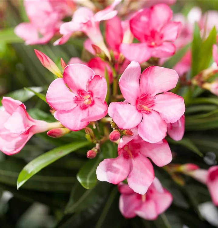 Nerium oleander, rosa bildet während der gesamten Saison zahlreiche rosafarbene Blüten.