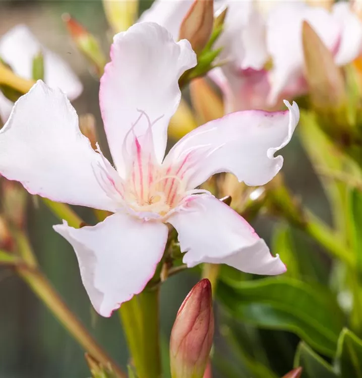 Der Oleander (Nerium oleander) ist eine sehr beliebte Kübelpflanze. Seine rosafarbenen Blüten erscheinen von Juni bis September. Verwenden Sie bevorzugt die spezielle Kübelpflanzenerde, denn sie verdichtet sich über längere Zeit nicht.