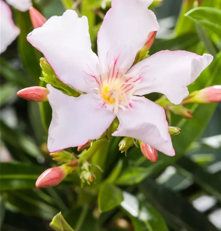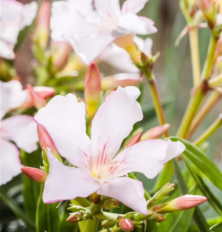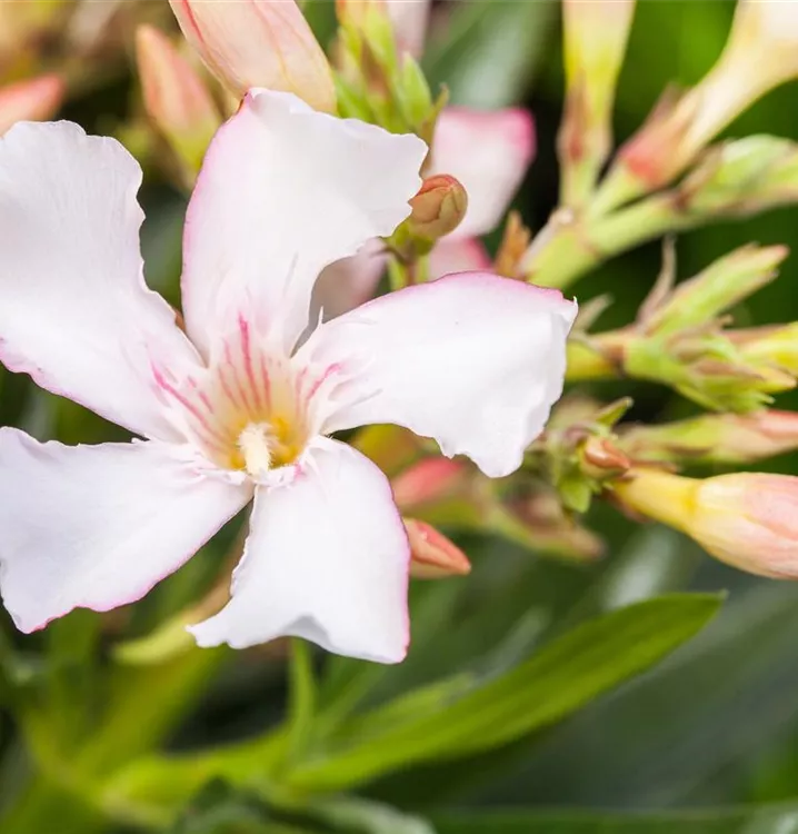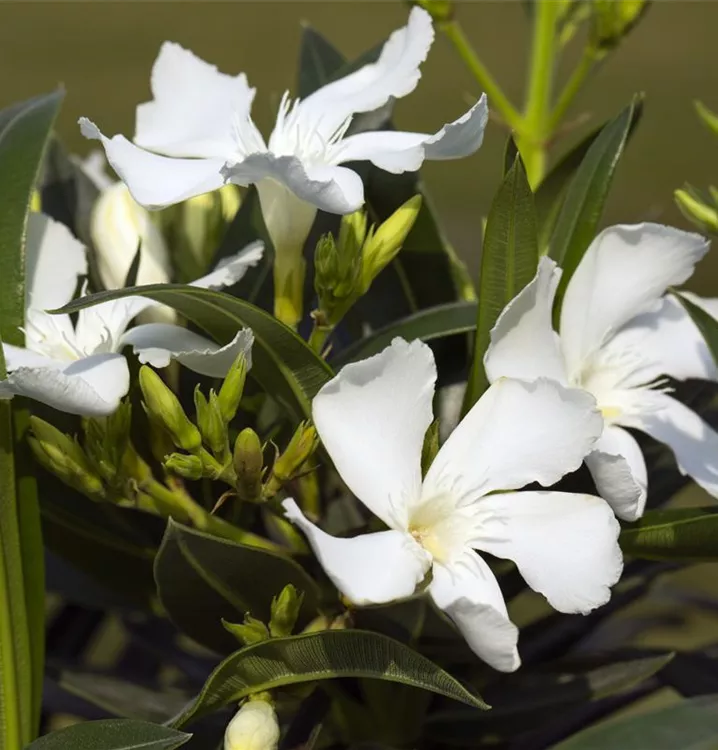 Nerium oleander, weiß bildet weiße Blüten ab Juni.