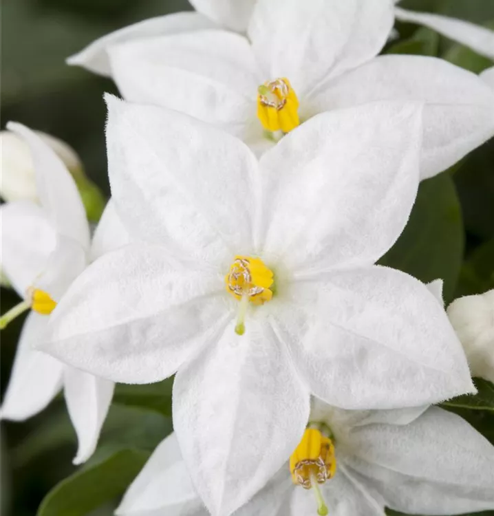 Solanum jasminoides bildet sternförmige, weiße Blüten ab Juni.