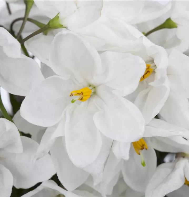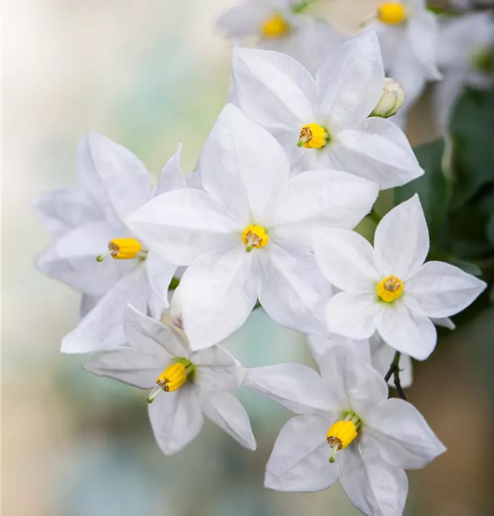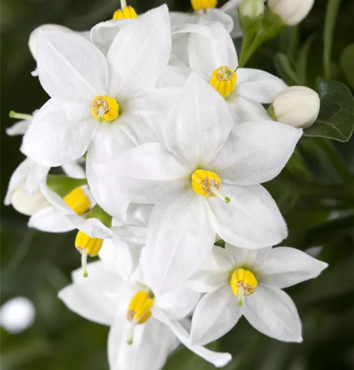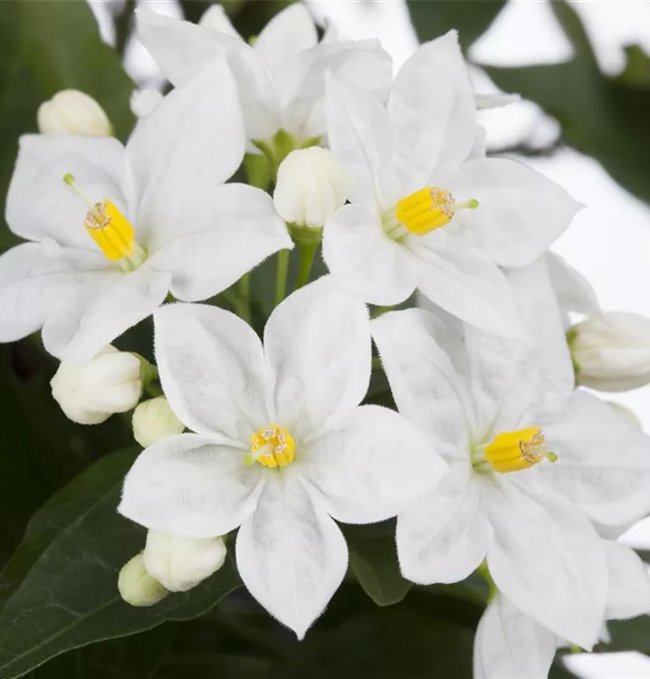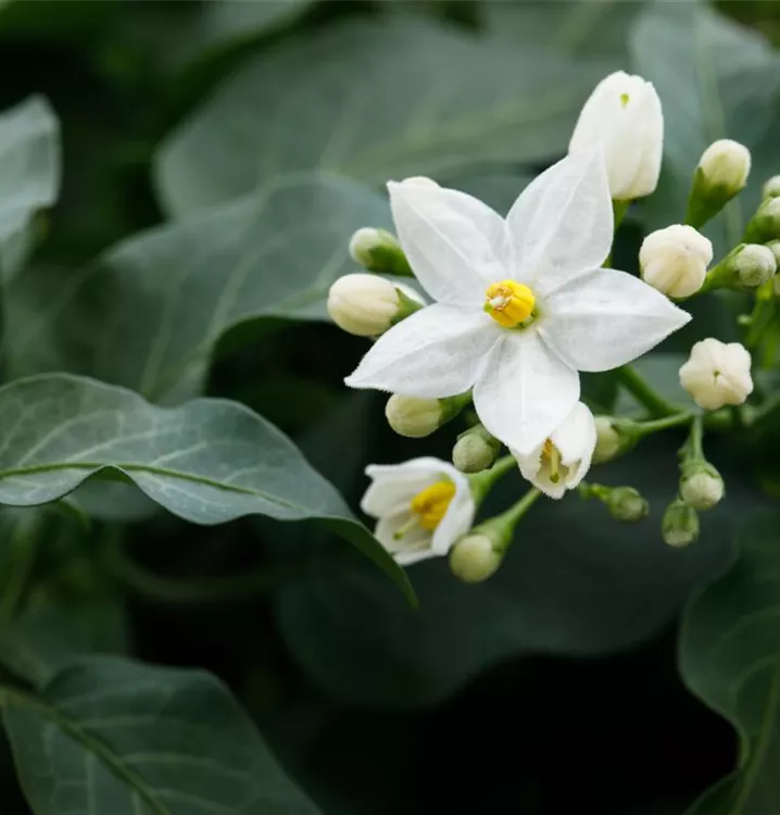 Der Jasminblütiger Nachtschatten (Solanum jasminoides) ist eine sehr beliebte, wintergrüne Kübelpflanze. Seine dekorativen Blüten sind sternförmig und erscheinen von Juni bis Oktober. Die dunkelgrünen Blätter sind lanzettlich. Der Standort sollte möglichst sonnig bis halbschattig sein. Eine durchlässige und nährstoffreiche Erde ist dabei ideal. Bei günstigen Bedingungen erreicht der Jasminblütiger Nachtschatten eine Höhe von ca. 2 m und wird bis zu 60 cm breit.