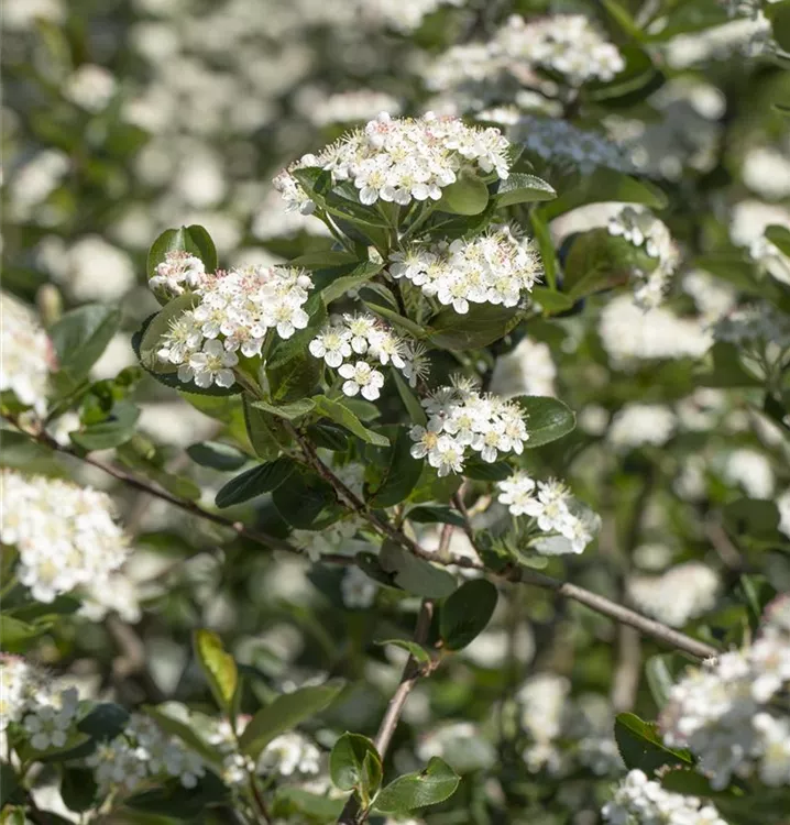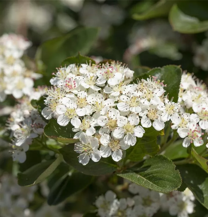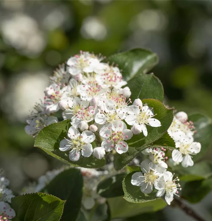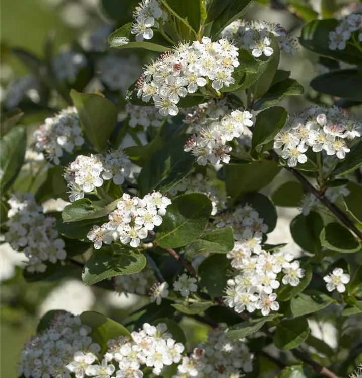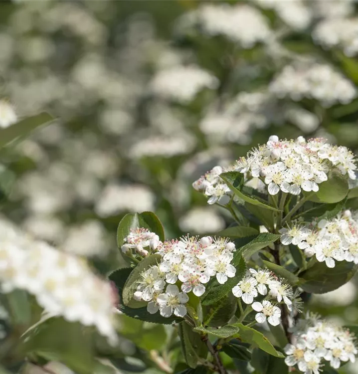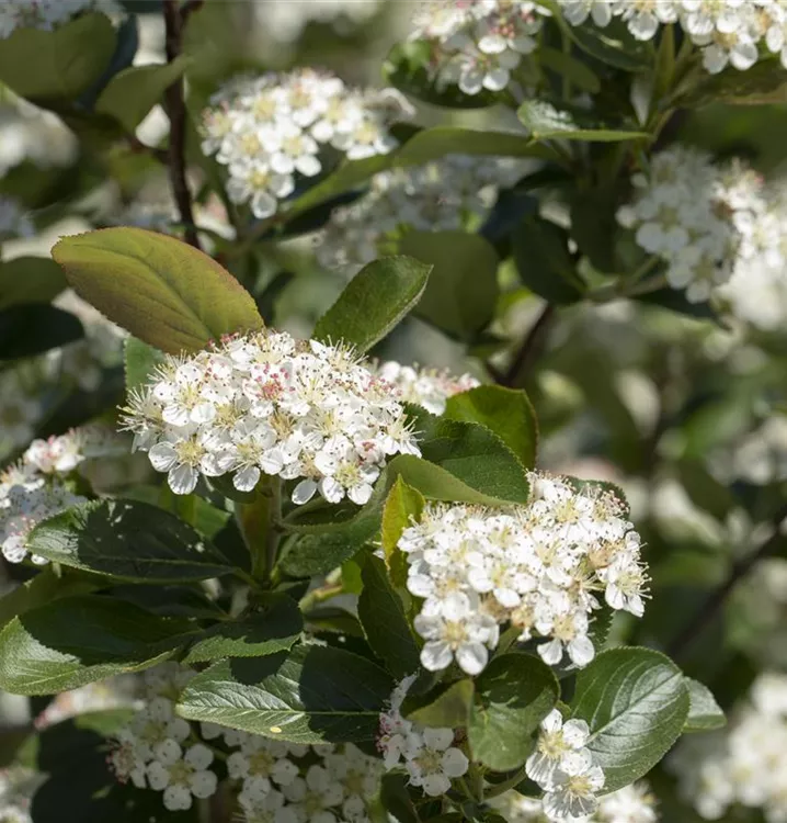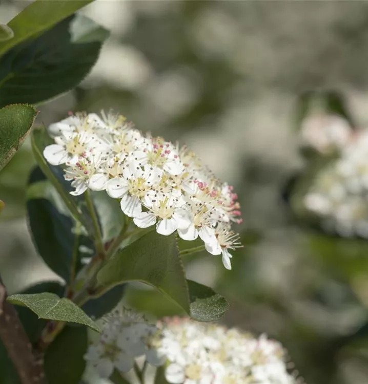 Aronia x prunifolia 'Viking' bildet in Rispen angeordnete, weiße Blüten ab Mai.