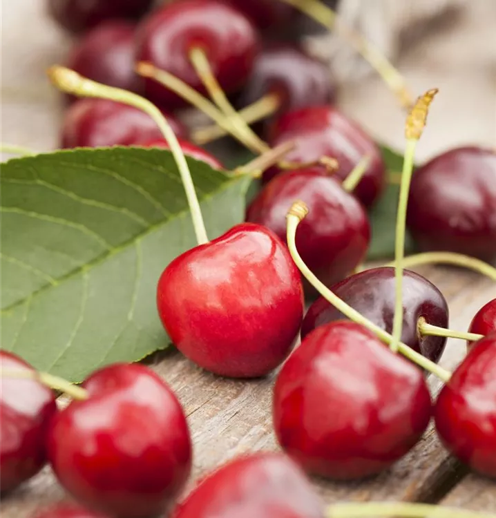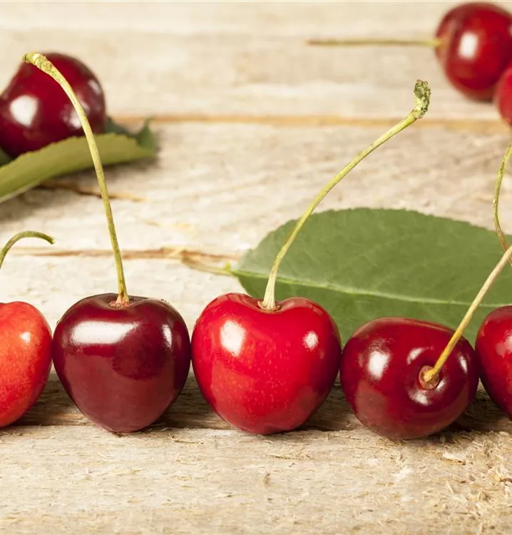 Die roten Steinfrüchte haben einen süßen, aromatischen Geschmack. Reifezeit ab Juni.