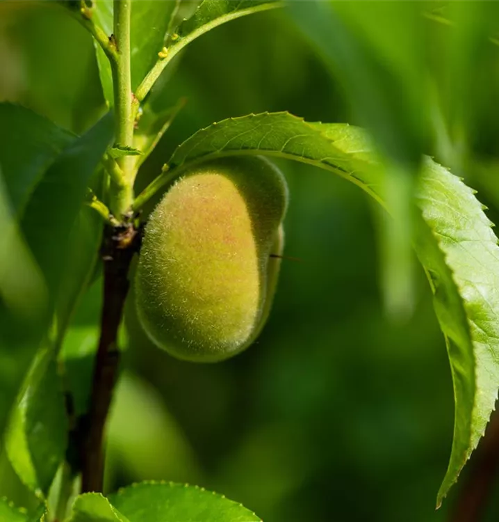 Der Tellerpfirsich (Prunus persica) bildet rot-gelbe Früchte. Sie sind flach und haben einen süßen Geschmack. Für eine ertragreiche Ernte ab Mitte Juli schaffen lockerer, nährstoffreicher, sandiger Boden und ein sonniger Standort optimale Bedingungen. Auch seine rosafarbenen Blüten sind eine schöne Erscheinung. Der Tellerpfirsich wird mit seinem breiten Wuchs etwa 4 m hoch und 4 m breit.
