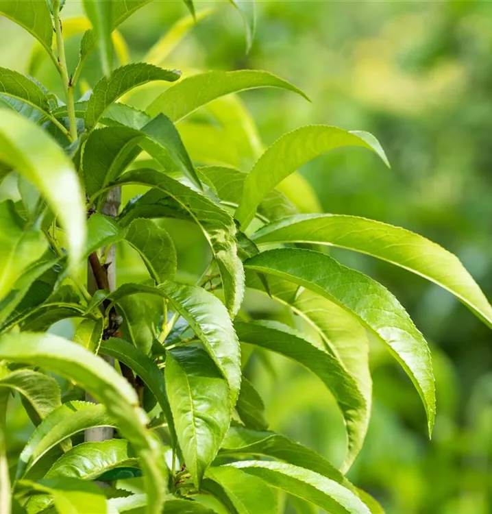 Die sommergrünen Blätter des Tellerpfirsichs sind mittelgrün, lanzettlich.