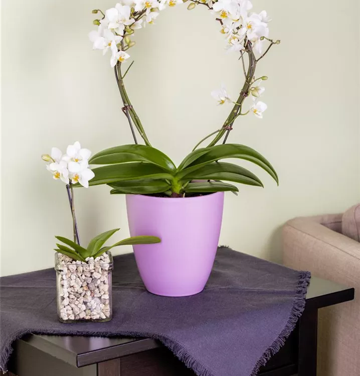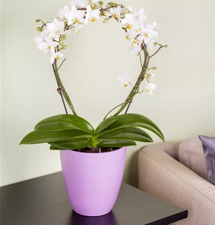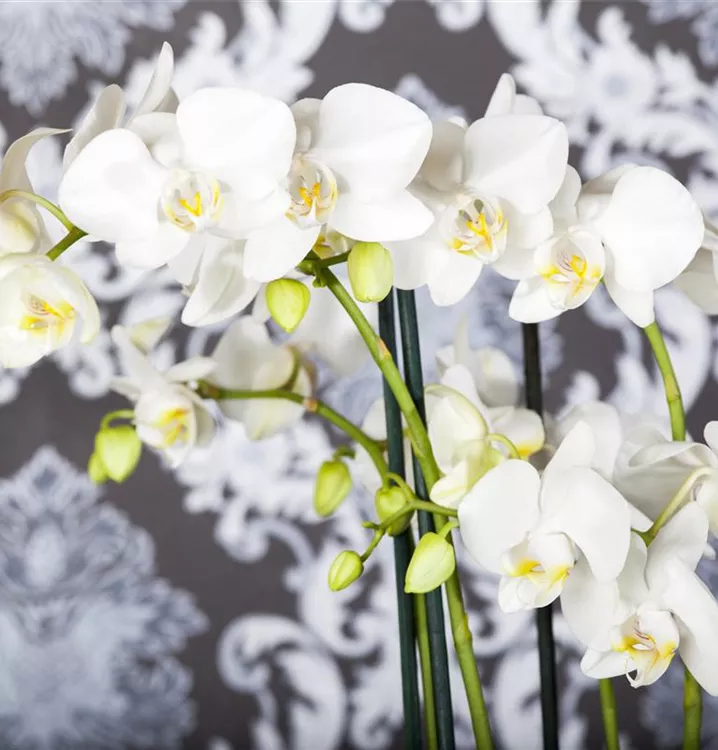 Die Schmetterlingsorchidee (Phalaenopsis) ist eine schöne, in weiß, rosa, hellgelb, pink oder dunkelrot blühende Orchidee. Ihre lippenförmigen Blüten sind sehr dekorativ und erscheinen in Rispen von Januar bis Dezember. Mit ihrem aufrechten Wuchs wird sie bis zu 50 cm hoch und 50 cm breit. Für das optimale Wachstum sorgen ein heller Standort sowie eine möglichst durchlässige und lockere Erde.